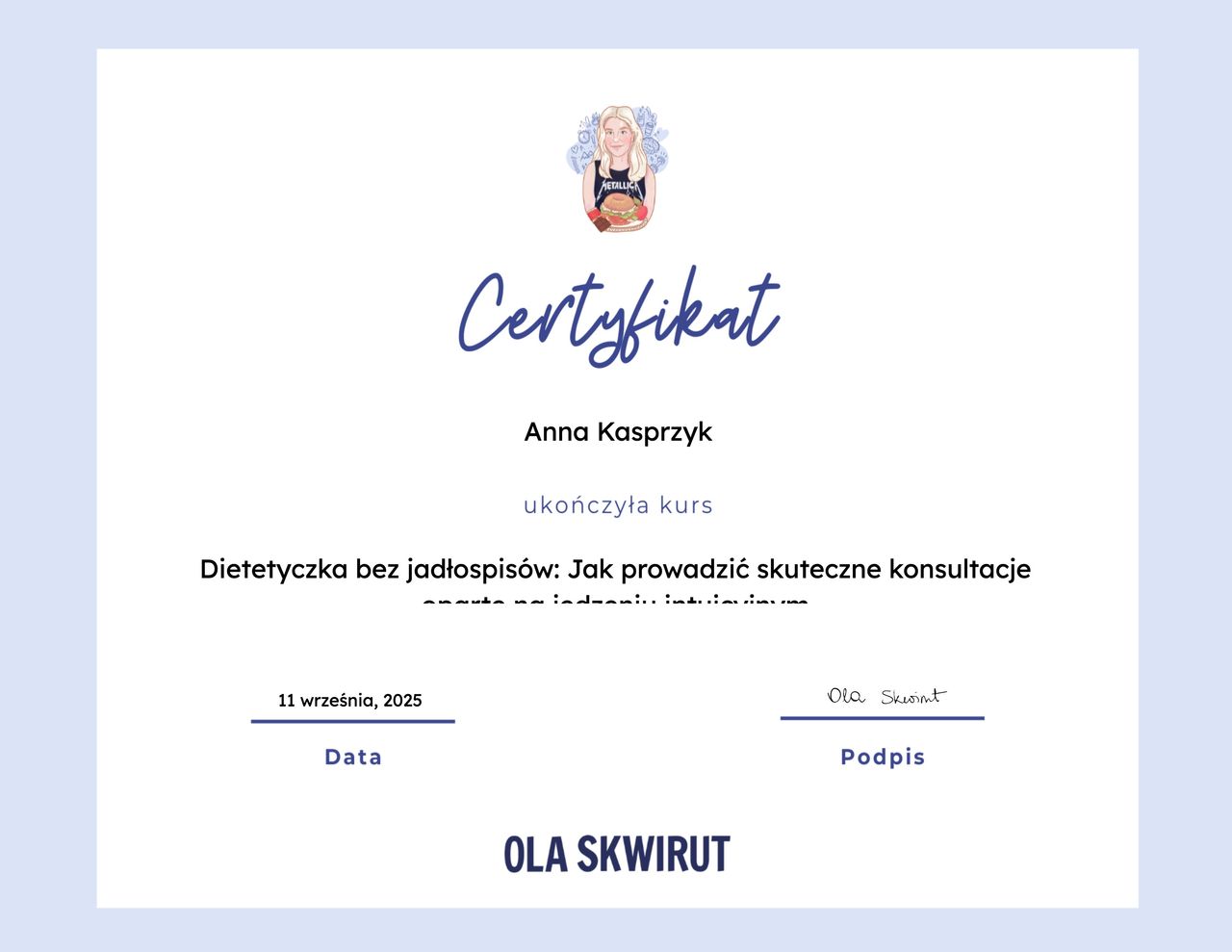 Szczególnie bliska jest mi idea jedzenia intuicyjnego oraz podejście oparte na szacunku do ciała, słuchaniu swoich potrzeb i budowaniu uważności w relacji z jedzeniem. Moim celem jest pokazanie, że jedzenie nie musi wiązać się ze stresem czy wyrzutami sumienia - może być przyjemnym i naturalnym elementem życia.