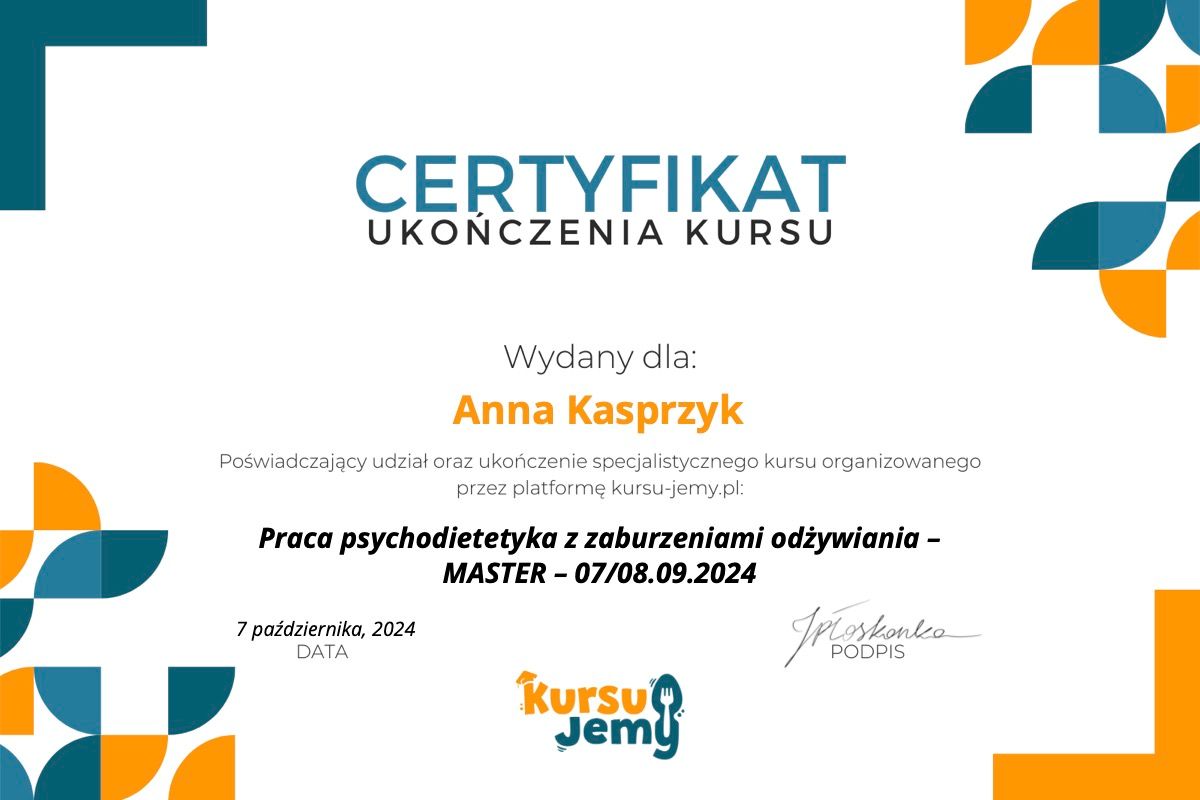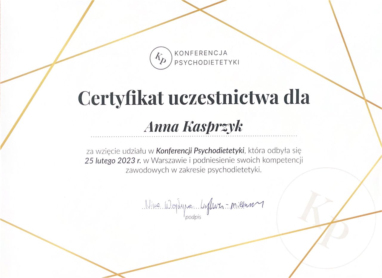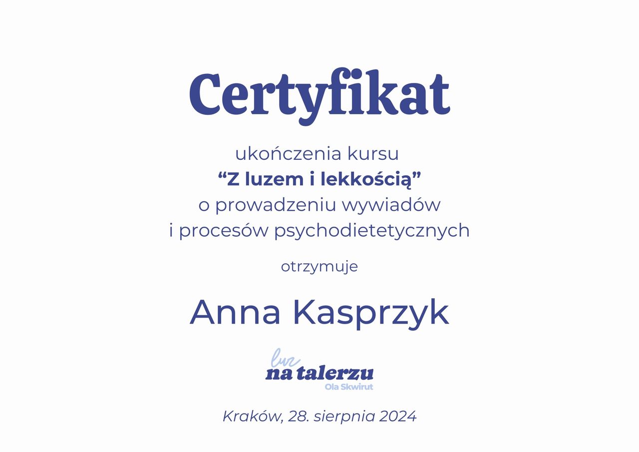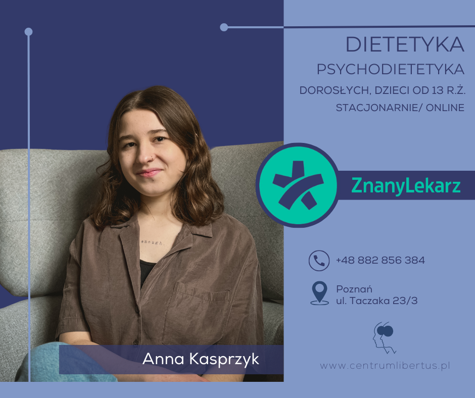Jestem dietetyczką i psychodietetyczką. Specjalizuję się w pracy z osobami, które cierpią na zaburzenia odżywiania, tkwią w błędnym kole diet, jedzą pod wpływem emocji, objadają się oraz stosują restrykcyjne diety. Pomagam budować zdrowszą i bardziej intuicyjną relację z jedzeniem - bez nieustannego kontrolowania swojego talerza, poczucia winy czy ciągłego myślenia o jedzeniu.