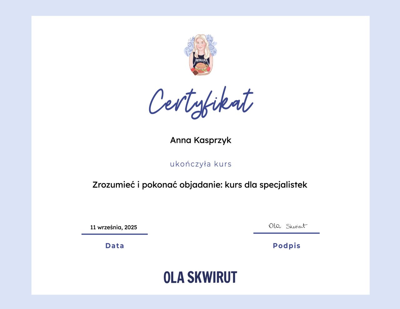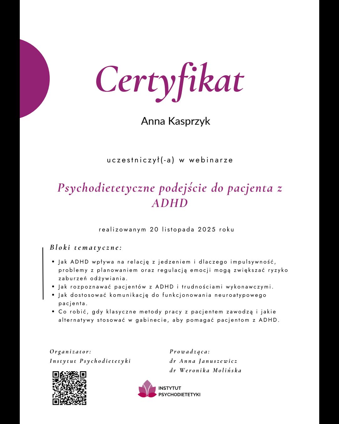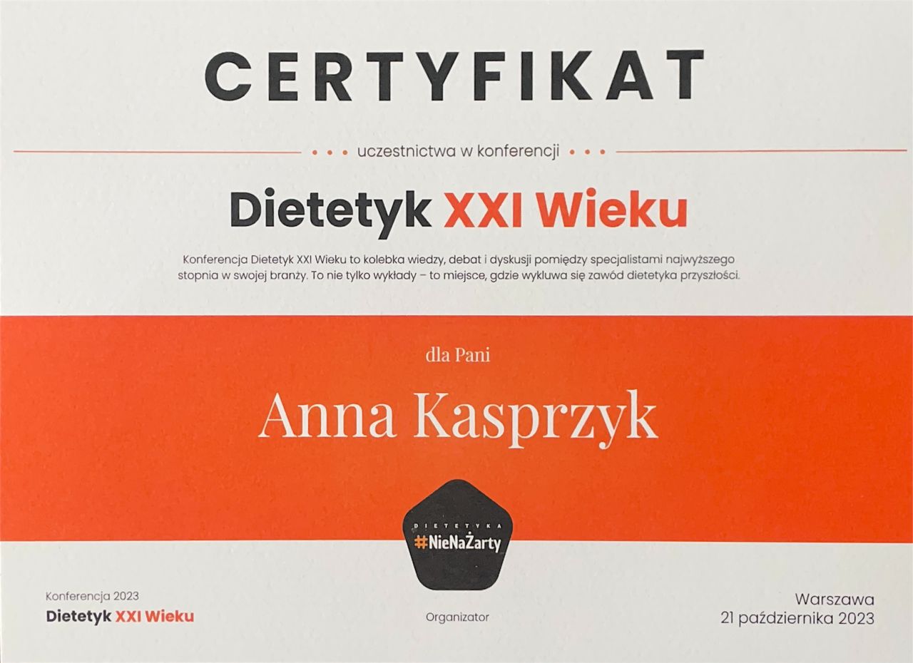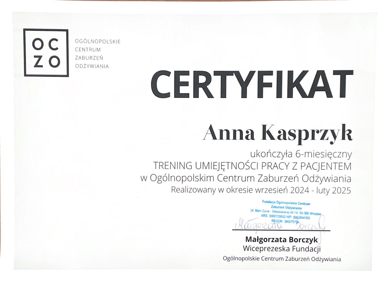 Jestem dietetyczką i psychodietetyczką. Specjalizuję się w pracy z osobami, które cierpią na zaburzenia odżywiania, tkwią w błędnym kole diet, jedzą pod wpływem emocji, objadają się oraz stosują restrykcyjne diety. Pomagam budować zdrowszą i bardziej intuicyjną relację z jedzeniem - bez nieustannego kontrolowania swojego talerza, poczucia winy czy ciągłego myślenia o jedzeniu.