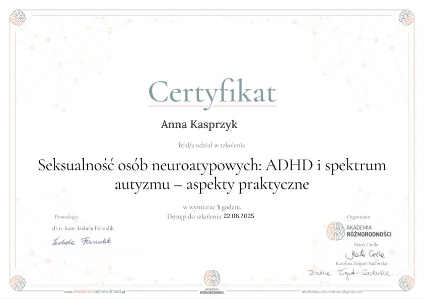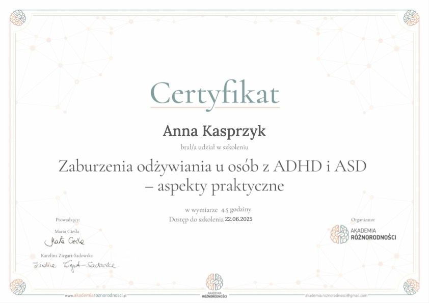 Wspieram również osoby z ADHD i w spektrum autyzmu w odkrywaniu indywidualnych wyzwań żywieniowych i wypracowywaniu strategii pozwalających na wdrożenie w życie bardziej wspierających nawyków.