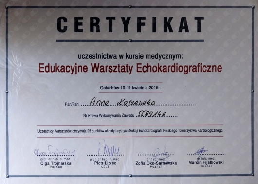Jestem specjalistą kardiologii i chorób wewnętrznych, aktualnie zajmuję się diagnostyką chorób serca. W trakcie pracy w Oddziale Chorób Wewnętrznych w Szpitalu Miejskim w Poznaniu zdobyłam duże doświadczenie w leczeniu chorób internistycznych, co pozwoliło mi na dalszy rozwój zawodowy w kierunku diagnostyki i leczenia chorób serca. Wykonuję badania echokardiograficzne, próby wysiłkowe, badania Holter ekg.