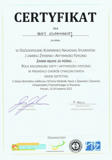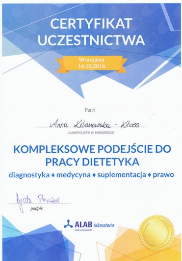 Jestem magistrem dietetyki ze specjalnością dietetyki klinicznej oraz sportowej, absolwentką Collegium Medicum UMK w Bydgoszczy. Każdego dnia poszerzam swoją wiedzę i doświadczenie, aby w pełni profesjonalnie i skutecznie pomóc moim pacjentom. Moja praca to moja pasja, angażuję się w to co robię w 100 procentach. Wierzę, że prawidłowo dostosowany sposób żywienia, aktywność fizyczna oraz odpowiednie podejście są w stanie poprawić stan zdrowia i pomóc osiągnąć sukces oraz zadowolenie. W swojej pracy uczę pacjentów zdrowych nawyków żywieniowych. Skupiam się przede wszystkim na indywidualnym podejściu do pacjenta, biorąc pod uwagę preferencje żywieniowe, aktywność fizyczną, towarzyszące choroby, badania diagnostyczne czy alergie i nietolerancje pokarmowe.