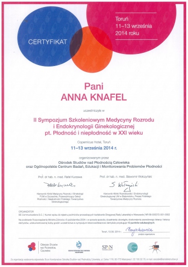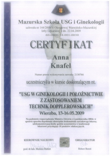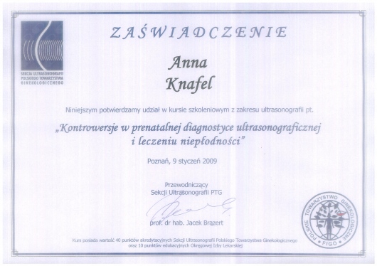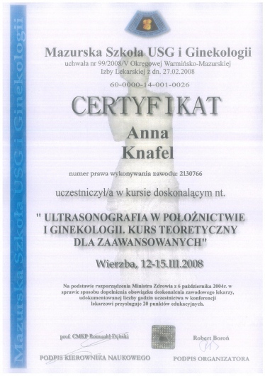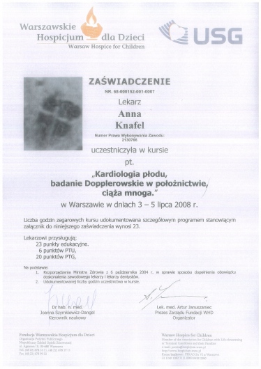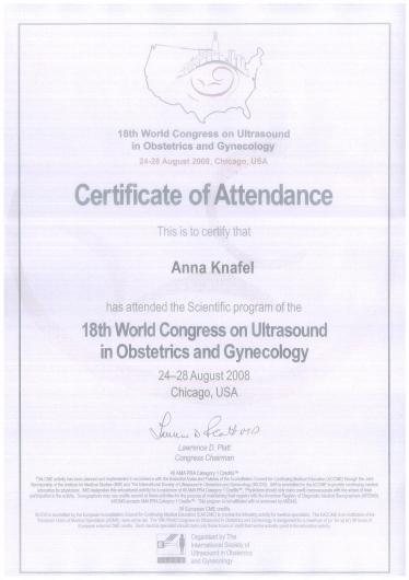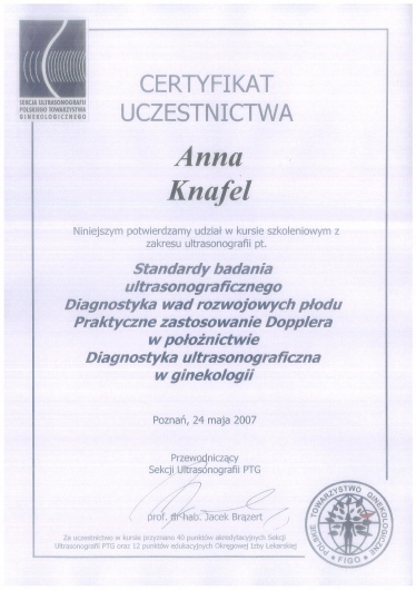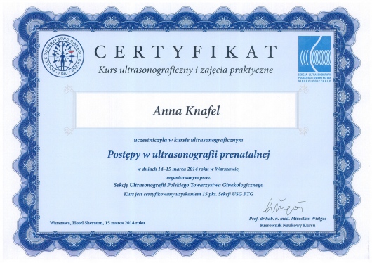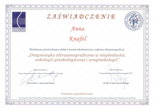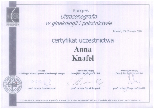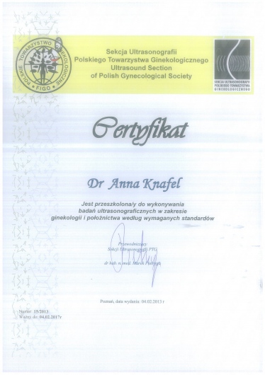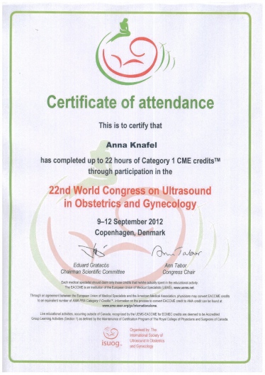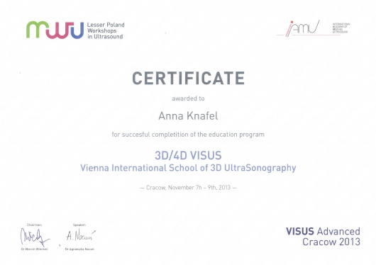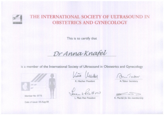 I am a physician, a gynecologist- obstetrician. I graduated from the Jagiellonian University Medical College. For a long time, I worked as a university teacher at the Department of Gynecology and Obstetrics, Jagiellonian University Medical College. In 2007, my medical doctor’s diploma, which I received in the USA, was officially recognized. My MD-PhD I obtained on the basis of my doctor thesis dealing with the problems concerning the immune system in the ectopic pregnancy. This profession is my passion. I gained my experience working at the Department of Gynecology and Oncology in the Krakow University Hospital. I am an experienced specialist in obstetric, gynecologic and oncologic ultrasound, and all of my examinations are carried out according to the newest recommendations of the Ultrasound Section of the Polish Gynecological Society, Fetal Medicine Foundation (FMF) as well as The International Society of Ultrasound in Obstetrics and Gynecology (ISUOG). My interests also include issues concerning the diagnosis and treatment of infertility and methods of assisted reproduction. Out of concern for my Patients, I constantly try to extend my knowledge through participating in numerous courses and congresses. Being both a doctor and a woman, I am aware of the intimacy of an appointment at a gynecologist, and that is the reason why I pay a special attention to an individual approach to each of my Patients, which is the way I would like to be treated as a Patient. Best regards, Anna Knafel