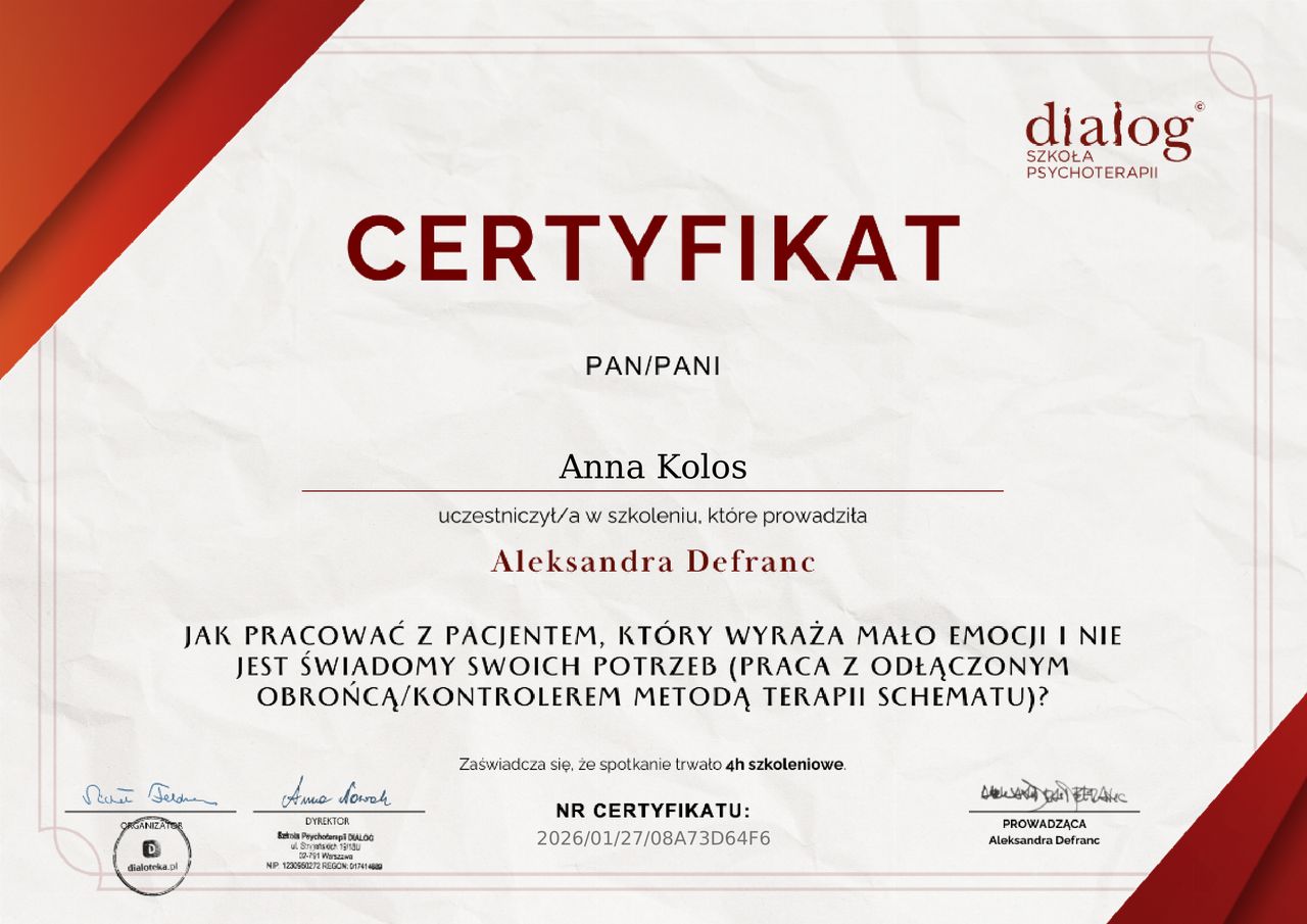 Pani Anna jest bardzo zaangażowanym specjalistą. Cechuje się empatia i przedstawia cały wachlarz narzędzi do radzenia sobie w sytuacjach, które są dla mnie ciężkie. Jest przygotowana do każdego spotkania, wykazuje ogromne zaangażowanie. Czuję ze moje problemy są dla niej istotne i nigdy ich nie bagatelizuje. Mam porównanie z kilkoma innymi terapeutami i z czystym sumieniem mogę zarekomendować Panią Anne Kolos jako terapeutę kompetentnego i z sercem.