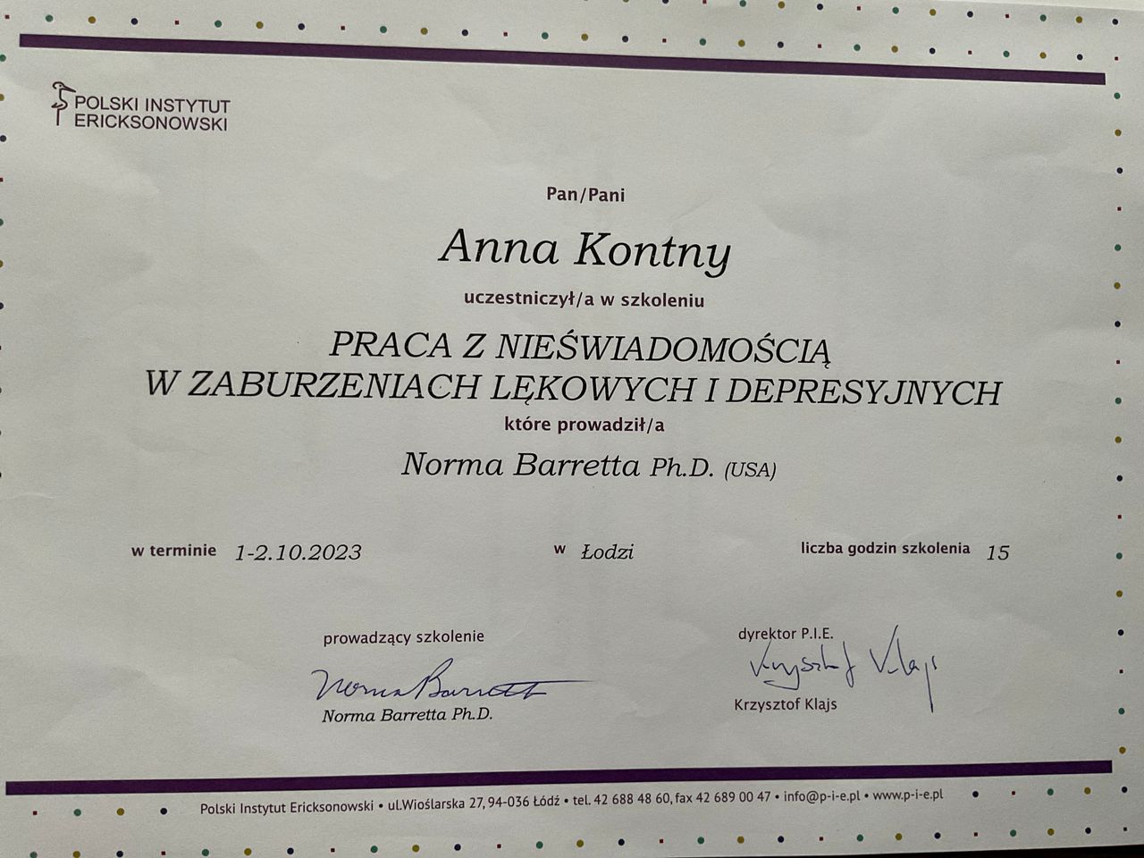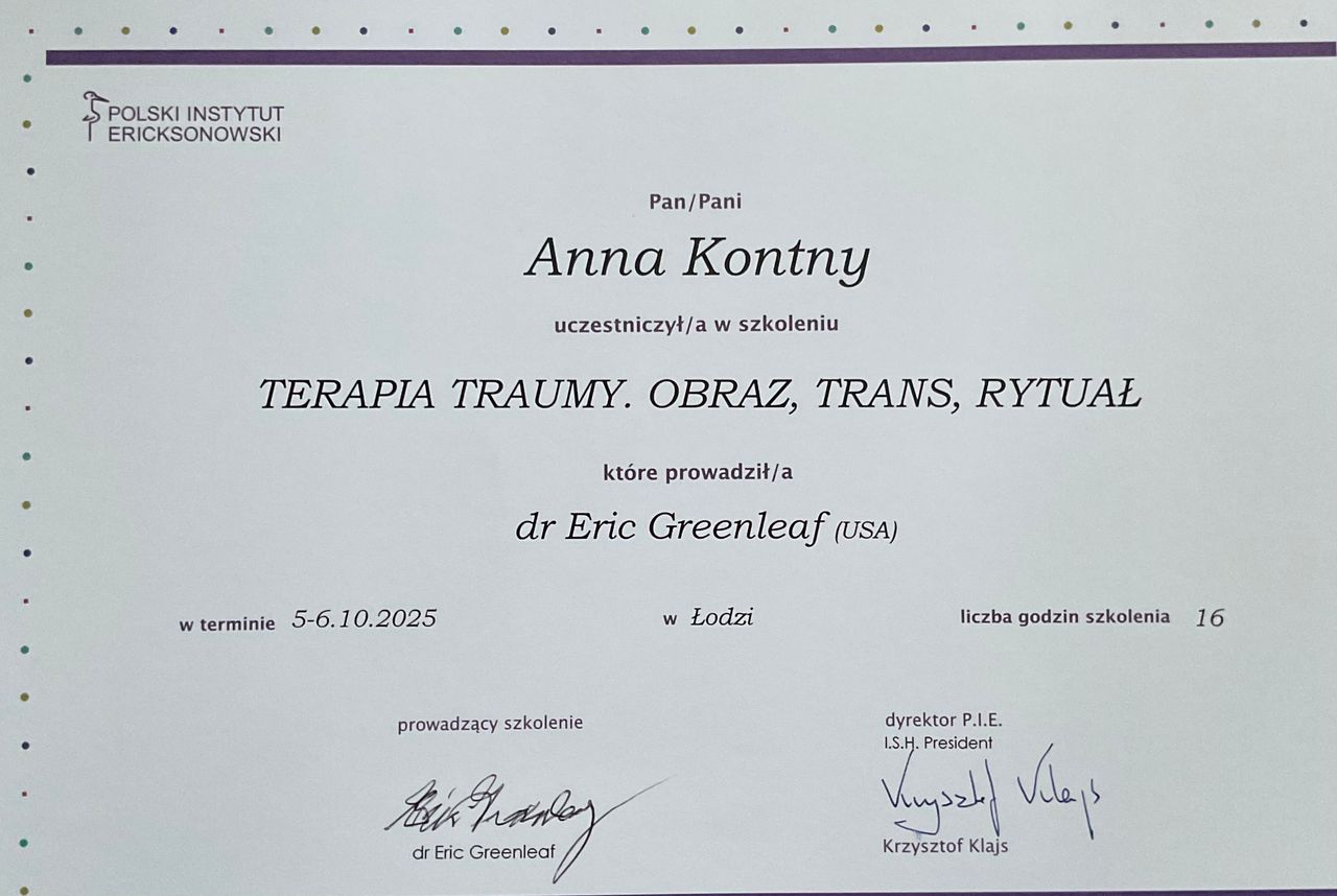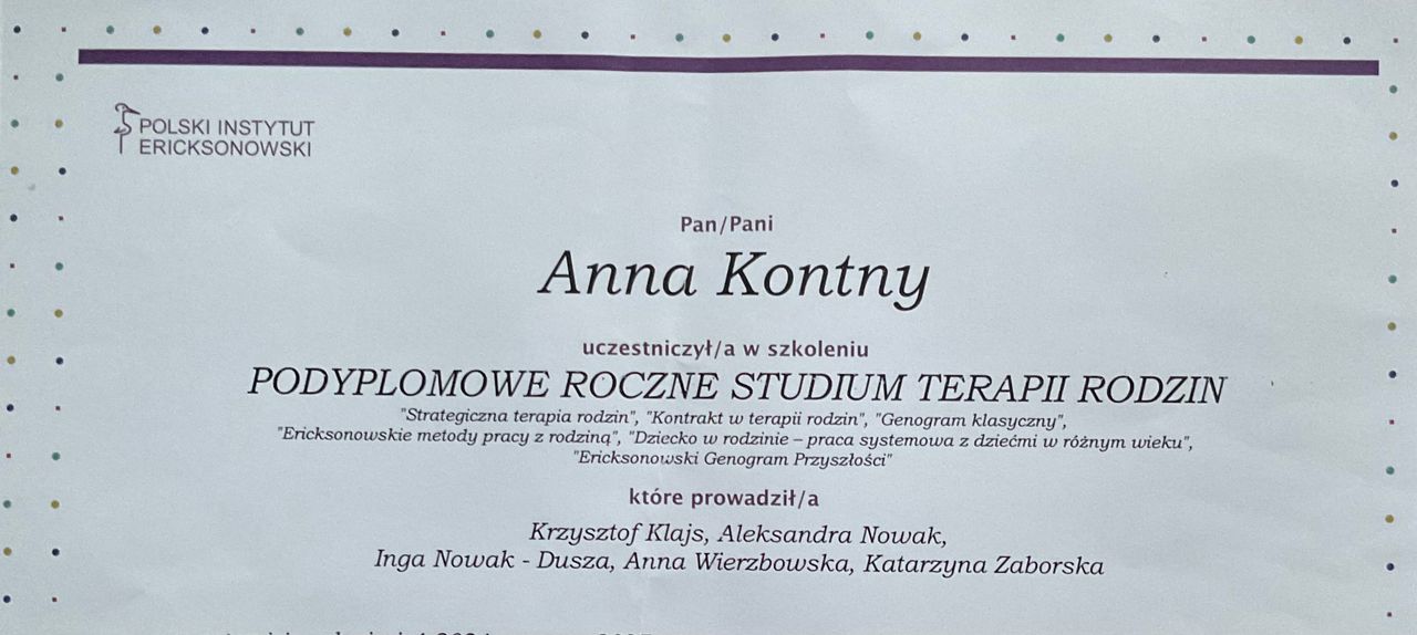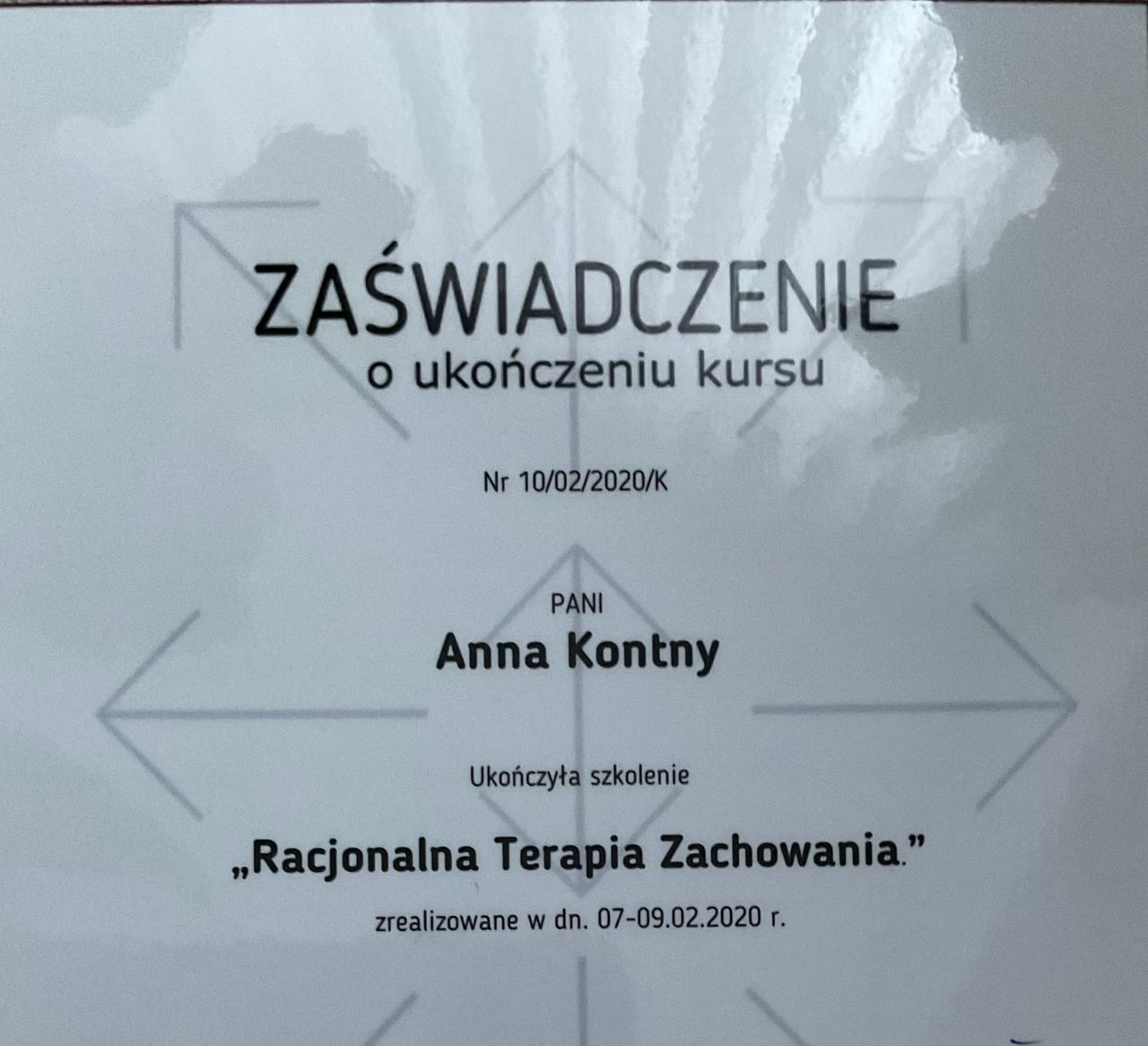 Ukończyłam pięcioletnie studia psychologiczne o specjalności psychologia kliniczna, podyplomowe studia z przygotowania pedagogicznego, roczne Studium Terapii Poznawczo - Behawioralnej, Podyplomowe Studium Terapii Rodzin, szkolenie I stopnia Racjonalnej Terapii Zachowania oraz Terapii Skoncentrowanej na rozwiązaniach, I i II część Hipnozy Ericksonowskiej.Brałam udział w warsztatach prowadzonych przez uczniów Miltona Ericksona: Jeffreya Zeiga, Normę Barrettę. Uczestniczyłam między innymi w takich szkoleniach jak: Diagnoza neuropsychologiczna dzieci i młodzieży, Trener Treningu Kontroli Złości, Trener Umiejętności Społecznych, Kids’ Skills - Dam Radę! Rodzicielstwo i wychowanie…- Ben Furman, Psychoterapia następstw stresu oraz zaburzeń psychosomatycznych, Psychoterapia depresji, Praca z pacjentem w żałobie, Kontrola i spożytkowanie bólu oraz innych objawów z ciała, Terapia systemowa rodzin, Psychoterapia pacjentów z natręctwami - Krzysztof Klajs, Hypnotic treatment of traumas - Claude Virot, Ego states and the body for acute trauma management - Carl Hattingh, Coming home to ourselves - Julie H. Linden.