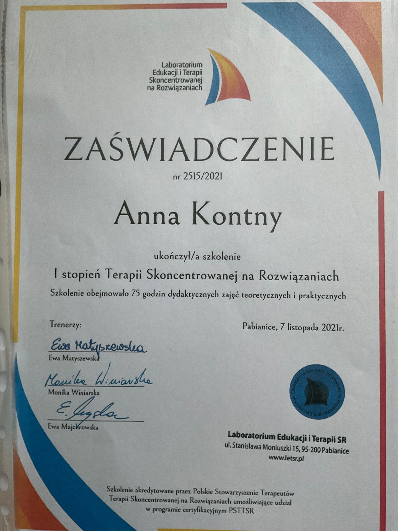 Nazywam się Anna Kontny. Jestem psychologiem oraz psychoterapeutą w trakcie certyfikacji. Pracuję z osobami dorosłymi oraz rodzinami, oferując wsparcie w bezpiecznej, pełnej szacunku i zrozumienia atmosferze.