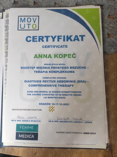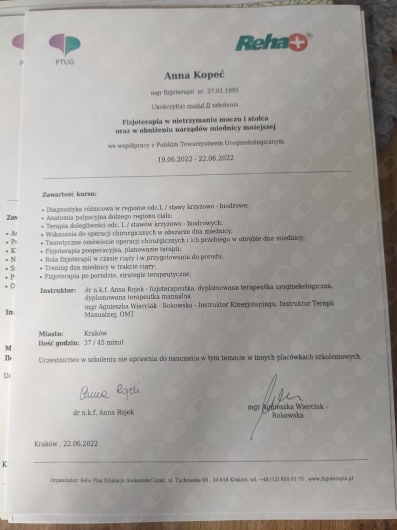 Jaki jest zakres porad oferowanych przez Anna Kopeć?Anna Kopeć to fizjoterapeuta. Na podstawie swojego doświadczenia i wykształcenia Anna Kopeć oferuje usługi takie jak: konsultacja fizjoterapeutyczna, masaż dla kobiet ciężarnych, Masaż leczniczy, masaż tkanek głębokich, masaż Kobido, suche igłowanie, fizjoterapia kobiet w ciąży / fizjoterapia okołoporodowa, fizjoterapia dna miednicy, Fizjoterapia po abdominoplastyce, fizjoterapia uroginekologiczna - bóle miesiączkowe i endometrioza.