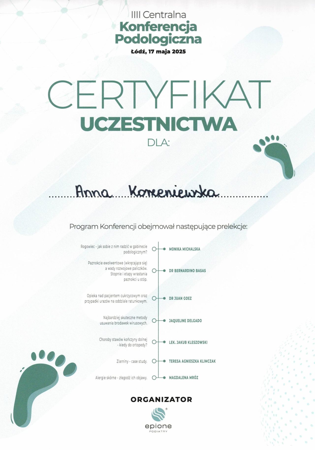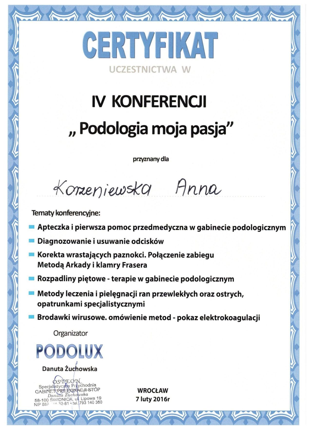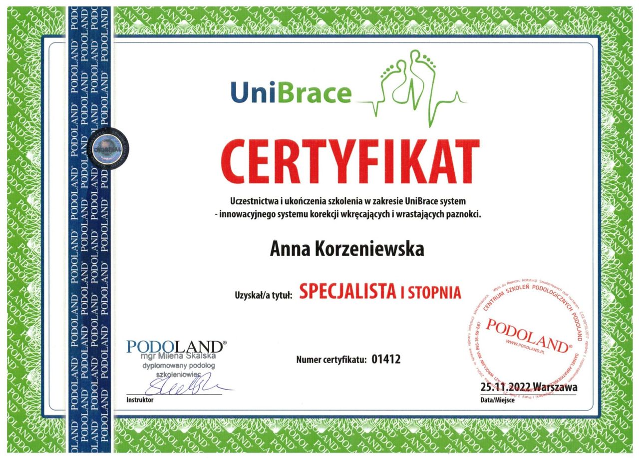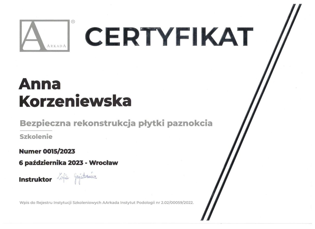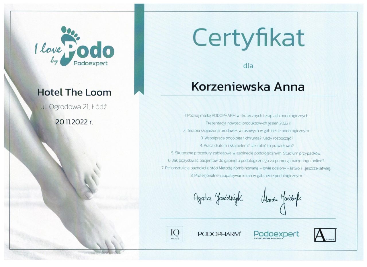 Jaki jest zakres porad oferowanych przez Anna Korzeniewska?Anna Korzeniewska to podolog. Na podstawie swojego doświadczenia i wykształcenia Anna Korzeniewska oferuje usługi takie jak: usunięcie retronychii, Leczenie wrastającego paznokcia, Konsultacja podologiczna, leczenie chorób paznokci, usunięcie odcisku / modzeli, Badanie mykologiczne, usuwanie wrastających paznokci, Kompleksowa usługa podologiczna, Klamra ortonyksyjna, usuwanie brodawek wirusowych.