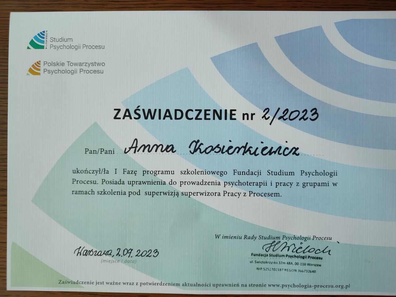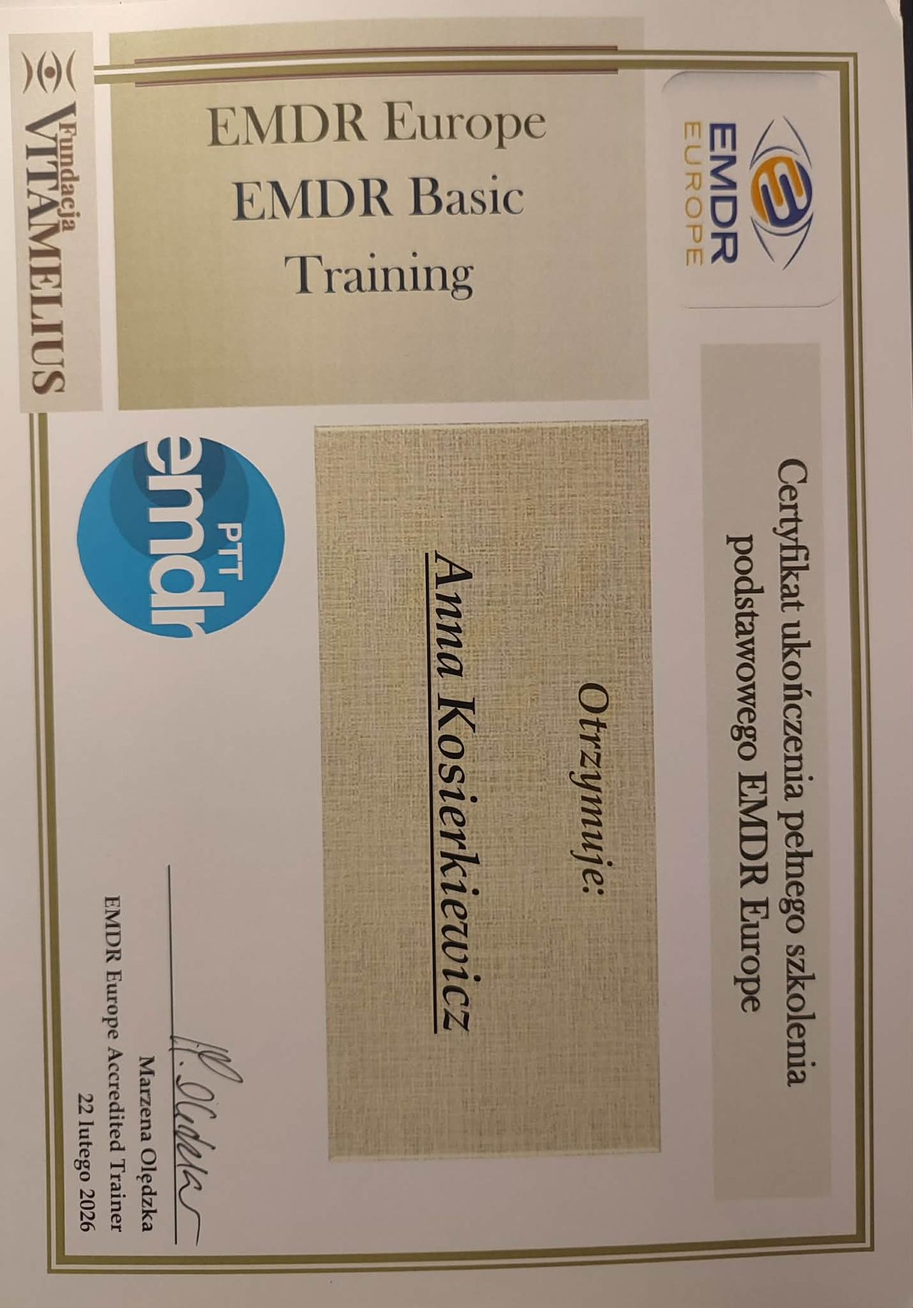 Jestem członkiem Polskiego Towarzystwa Terapii EMDR oraz Polskiego Towarzystwa Psychologii Procesu.