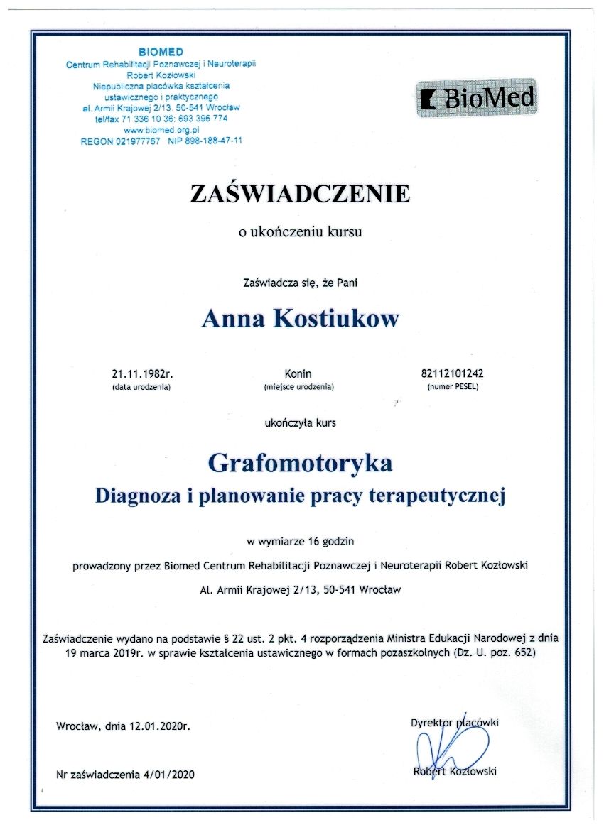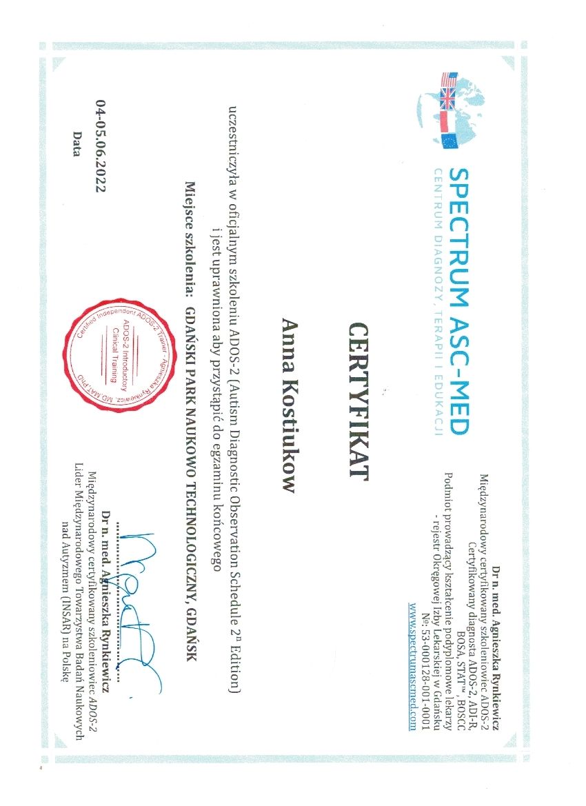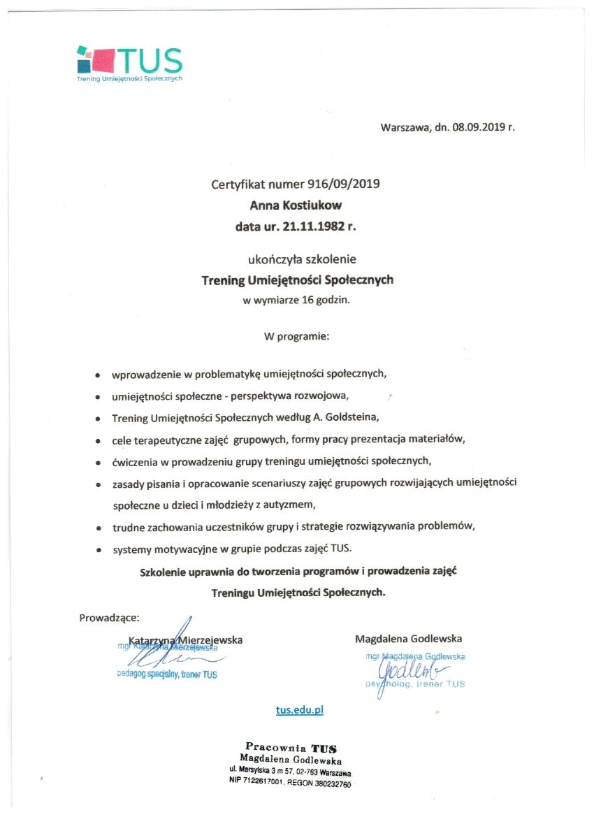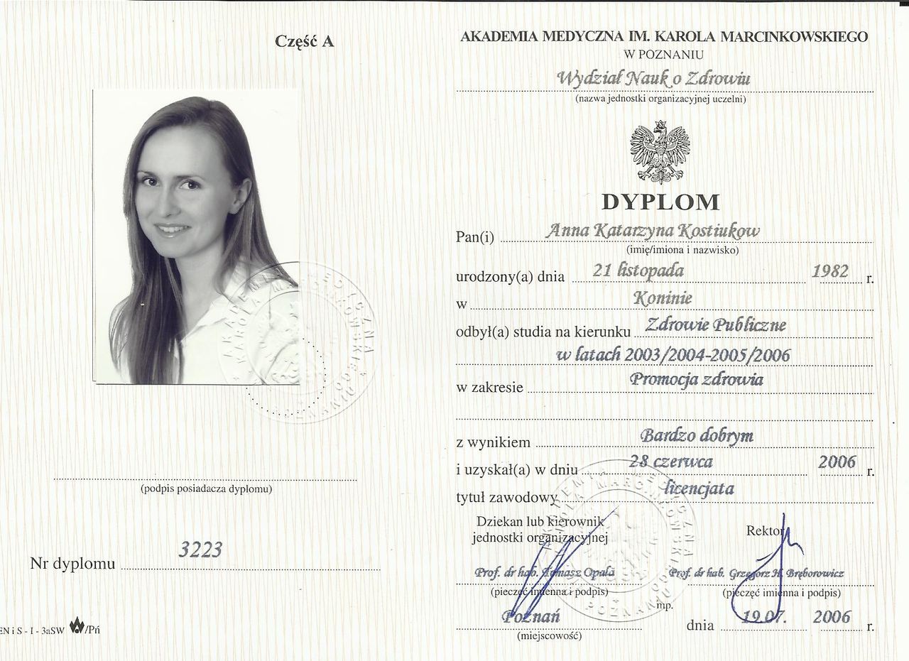 dr Anna Kostiukow- dr nauk o zdrowiu, fizjoterapeutka, managereka zoz, managerka oświaty, absolwentka zdrowia publicznego- ze szczególnym uwzględnieniem promocji zdrowia w autyzmie, doradczyni zawodowa osób z niepełnosprawnościami.