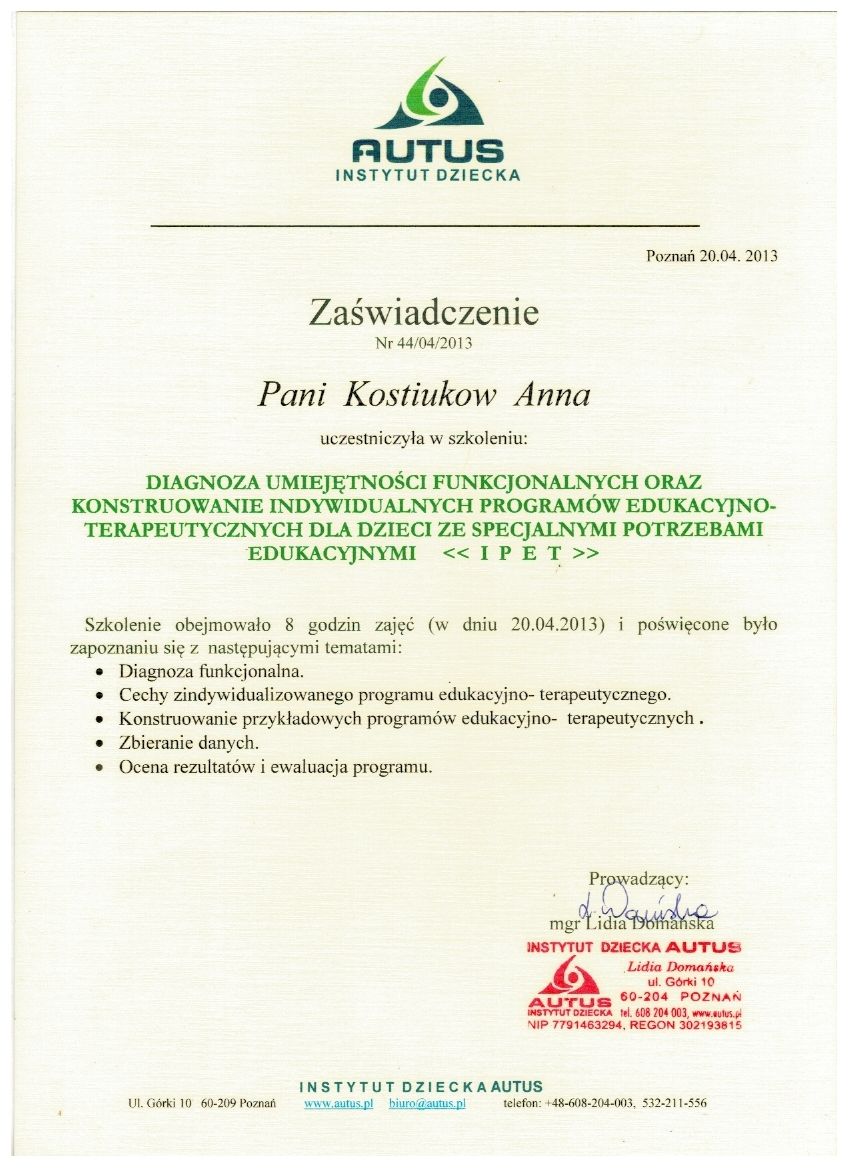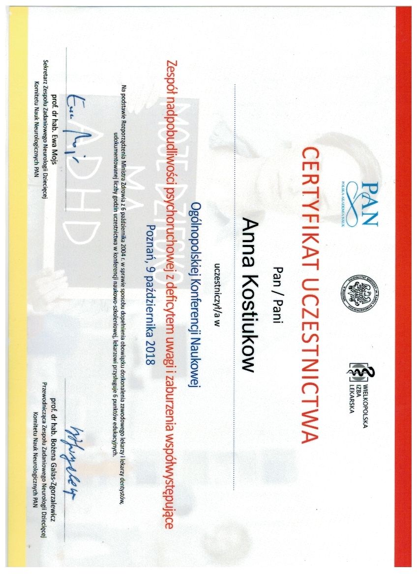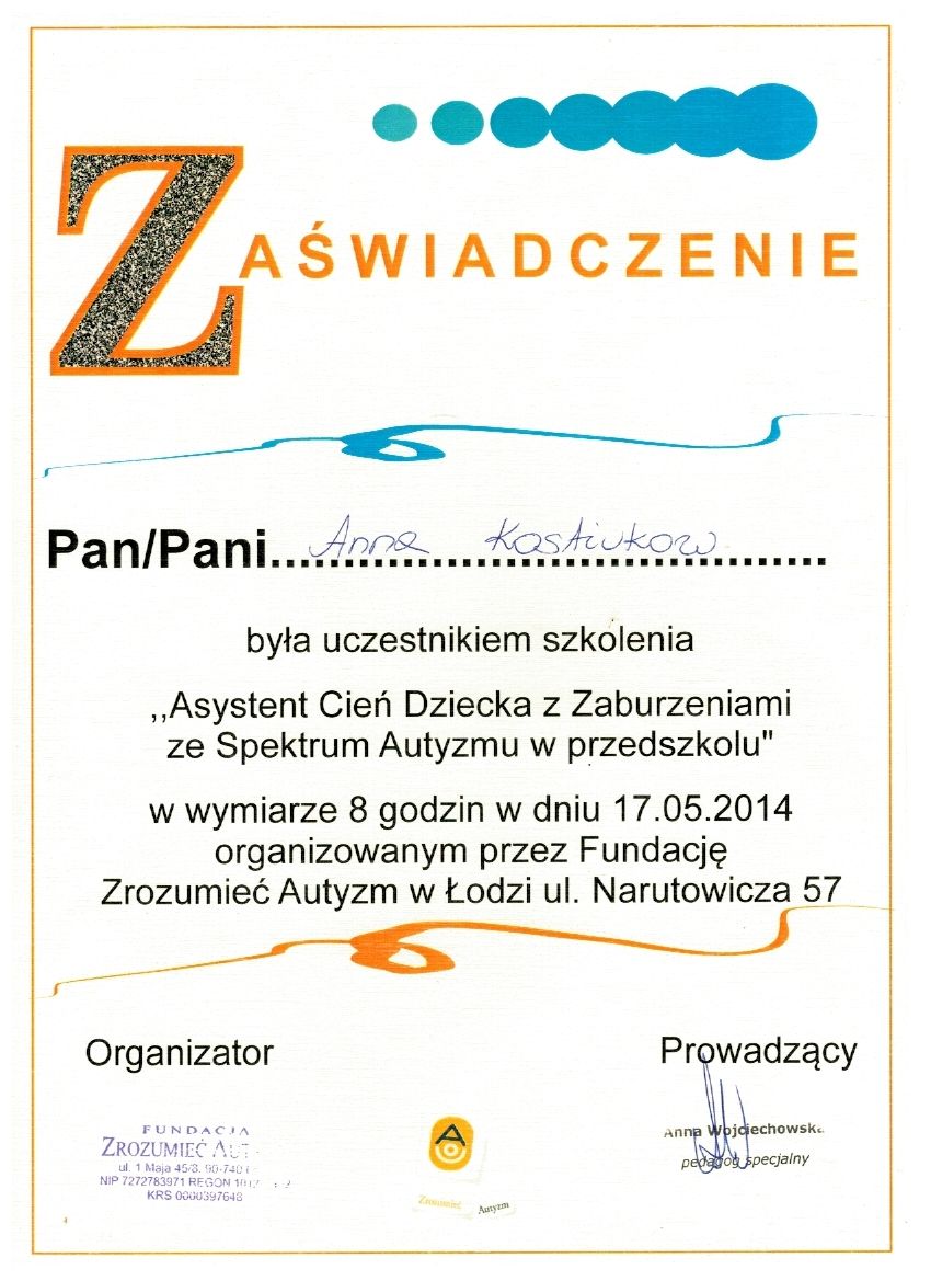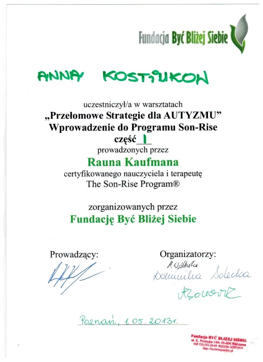 dr Anna Kostiukow- dr nauk o zdrowiu, fizjoterapeutka, managereka zoz, managerka oświaty, absolwentka zdrowia publicznego- ze szczególnym uwzględnieniem promocji zdrowia w autyzmie, doradczyni zawodowa osób z niepełnosprawnościami.