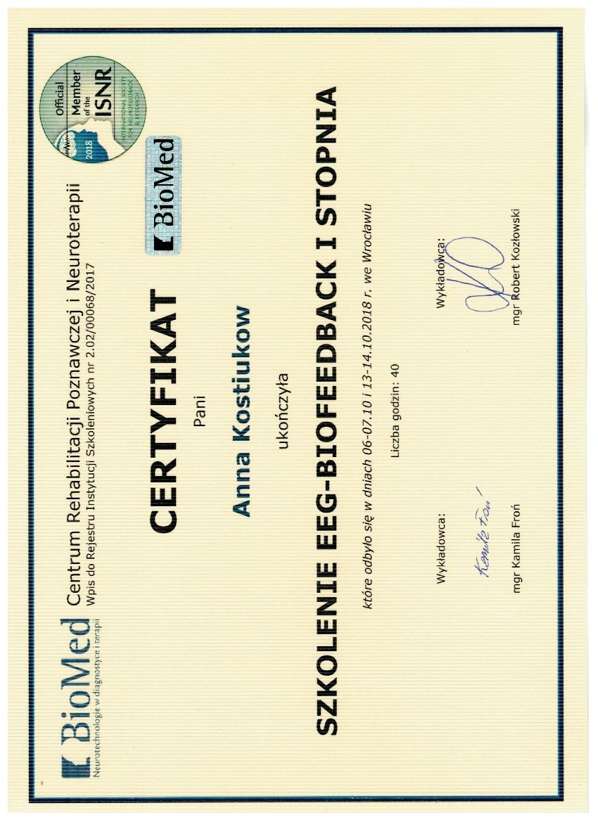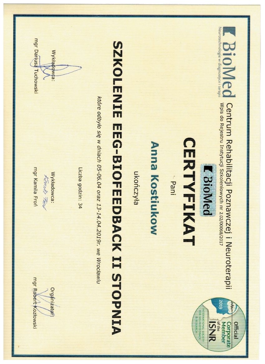 Jakie ubezpieczenia akceptuje Anna Kostiukow?Anna Kostiukow nie przyjmuje w ramach ubezpieczenia, tylko w ramach płatnych wizyt prywatnych. W razie wątpliwości zalecamy kontakt ze specjalistą.