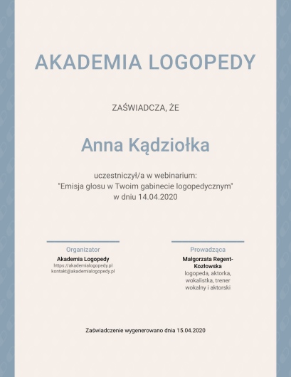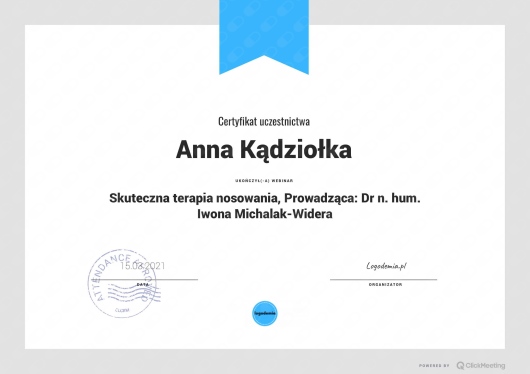 Jestem bardzo zadowolona z konsultacji, Pani Anna szczegółowo omówiła ze mną mój problem i wyjaśniła, nad czym powinnam pracować. Na wizycie nauczyłam się też wykonywać ćwiczenia, które mam robić w domu.