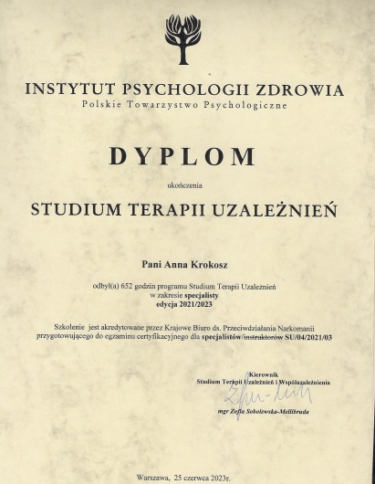 Wykształcenie: Ukończyłam 5-letnie studia magisterskie na kierunku Psychologia oraz 3-letnie studia licencjackie na kierunku Socjologia na Uniwersytecie Opolskim. Posiadam Certyfikat Specjalisty Psychoterapii Uzależnień, wydany przez Krajowe Centrum Przeciwdziałania Uzależnieniom, zdobyty w Instytucie Psychologii Zdrowia w Warszawie, a także Certyfikat Terapeuty EMDR (potwierdzający uprawnienia do pracy tą metodą) uzyskany w Fundacji Vitamelius. Stale poszerzam i podnoszę swoje kwalifikacje, poprzez różne szkolenia, kursy, czy konferencje.