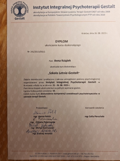 Stale doskonalę swój warsztat pracy, biorąc udział w licznych szkolenia, warsztatach oraz konferencjach. Pracuję zgodnie z Kodeksem Etycznym Polskiego Towarzystwa Psychoterapii Gestalt.