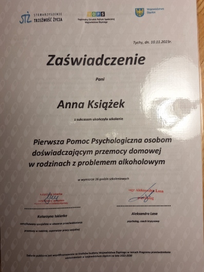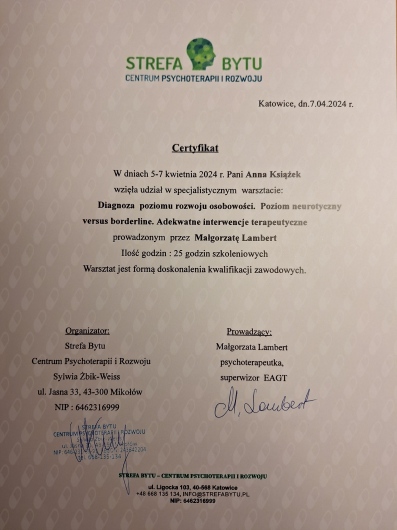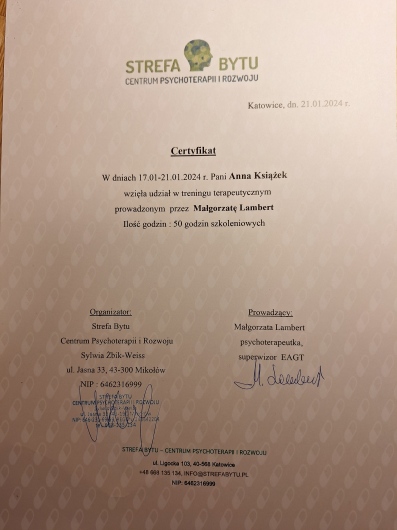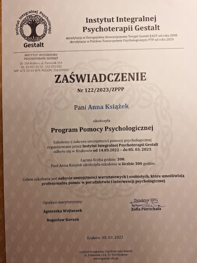Nazywam się Anna Książek i jestem psycholożką i psychoterapeutką Gestalt. Ukończyłam psychologię na Uniwersytecie Śląskim w Katowicach oraz jestem w trakcie całościowego szkolenia w Instytucie Integralnej Psychoterapii Gestalt w Krakowie (z akredytacją PTP i EAGT).