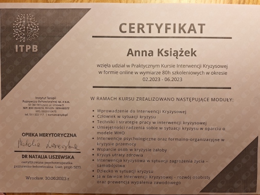 Pani Anna jest bardzo profesjonalna w udzielaniu pomocy. Jednocześnie jest osobą niezwykle empatyczną a jej pomóc to nie tylko rozmowa ale też konkretne wskazówki i działania. Jestem w stanie polecić Panią Anne każdej osobie, która szuka wsparcia psychologicznego. Osobiście wsparła mnie w dużym kryzysie, z którego udało mi się wyjść. Z perspektywy czasu widzę jak ważne było spotkanie jej na swojej drodze w tym czasie.
