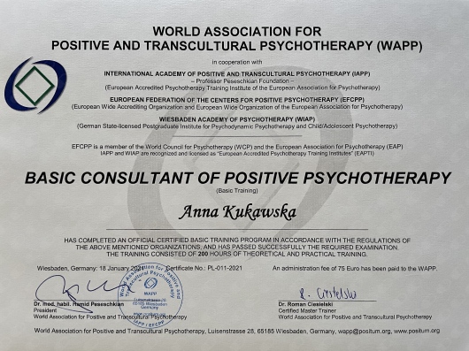 Jestem członkiem Światowego Towarzystwa Psychoterapii Pozytywnej (WAPP).