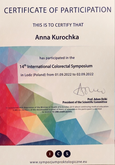Я закінчила Сумський медичний університет в Україні. У 2021 році пройшла навчальний курс з лазерних методів лікування гемороїдальних захворювань, який проходив в Лодзі. У 2022 році була учасником 14-го Міжнародного симпозіуму з проктології. Понад 5 рокіа я вивчаю, асистую та співорганізовую тренінги з проктології під керівництвом Міхала Пустого. У своїй практиці в основному займаюся діагностикою та лікуванням захворювань верхніх і нижніх відділів шлунково-кишкового тракту, особливо заднього проходу.