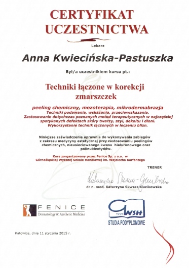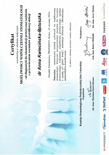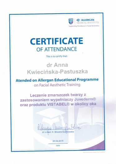 Ukończyłam studia podyplomowe- Medycyna Estetyczna dla Lekarzy. Zdobytą wiedzę wykorzystuję na co dzień w pracy. Dzięki temu mogę leczyć moich pacjentów kompleksowo - nie tylko dawać piękny i zdrowy uśmiech, ale także niwelować niedoskonałości urody, zachowując naturalne piękno mimo upływu lat.