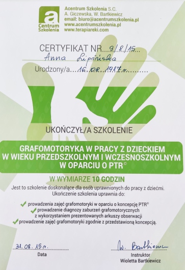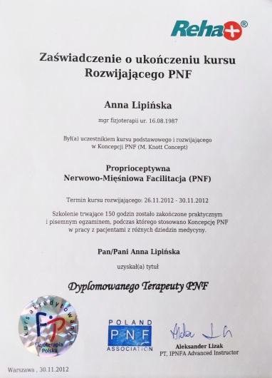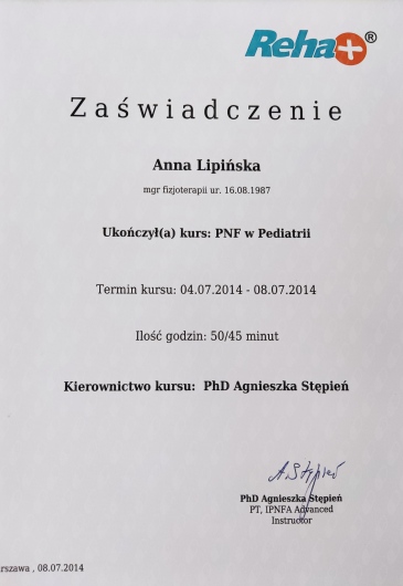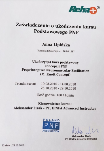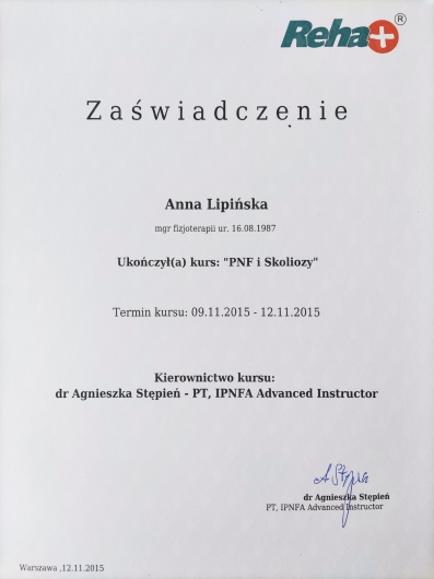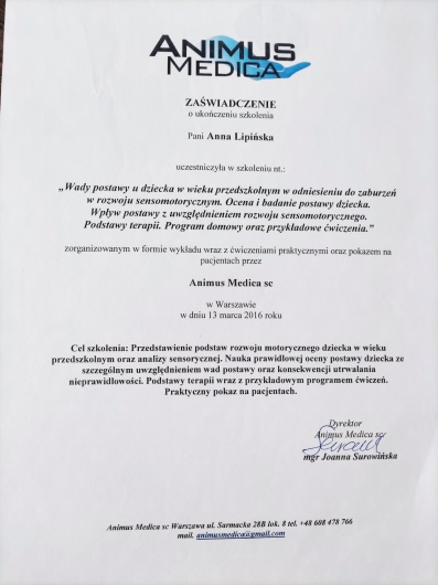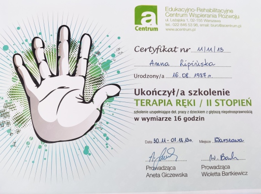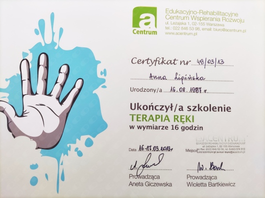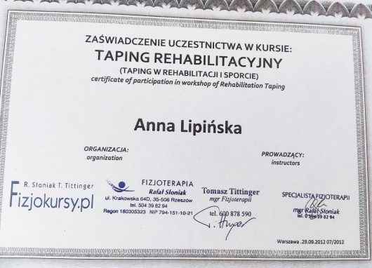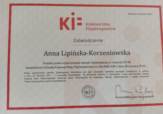 Jestem absolwentką studiów II stopnia Uniwersytetu Rzeszowskiego na kierunku Fizjoterapia. Pracę zawodową rozpoczęłam w 2011 i od tej pory pracuję głównie z dziećmi z zaburzeniami neurologicznymi, z wadami postawy, a od kilku lat również z zaburzeniami integracji sensorycznej i z problemami z motoryką małą. Pracuję z dziećmi powyżej 2 roku życia. Wybrałam fizjoterapię, bo chciałam aktywnie uczestniczyć w procesie powrotu do zdrowia u pacjentów. Przypadek sprawił, że poznałam pracę z dziećmi z uszkodzeniami ośrodkowego układu nerwowego (OUN) i tak już zostało. Przez całe studia wyjeżdżałam jako wolontariuszka na turnusy rehabilitacyjne i korzystałam z każdej możliwej okazji, aby nauczyć się czegoś nowego od bardziej doświadczonych fizjoterapeutów. Pozwoliło mi to podjąć pracę ze starszymi dziećmi z niepełnosprawnościami i objąć je kompleksową terapią. Obecnie zajmuję się pracą z dziećmi potrzebującymi wsparcia w rozwoju - moje podejście pozwala mi objąć je terapią oddziałującą na wszystkie potrzebujące obszary. W swojej pracy zajmuje się dziećmi z zaburzeniami neurologicznymi, prowadzę diagnozę i terapię integracji sensorycznej, prowadzę terapię ręki, a także terapię wad postawy. W związku ze swoim doświadczeniem w dziedzinie neurologii prowadzę również osoby starsze z problemami neurologicznymi. Łączenie różnych metod pracy pozwala mi optymalnie wykorzystywać zdolność organizmu do uczenia się, poprawy nieprawidłowych wzorców i lepszego funkcjonowania w społeczeństwie. Wiedza z zakresu integracji sensorycznej pozwala mi szerzej spojrzeć na problemy ruchowe dzieci z zaburzeniami neurologicznymi, umiejętności z zakresu terapii ręki pozwalają skuteczniej uczyć czynności samoobsługowych, a wiedza fizjoterapeutyczna pozwala skutecznie poprawiać umiejętności motoryczne i stabilność posturalną dzieciaków, które trafiają do mojego gabinetu. Pracuję również z pacjentkami uroginekologicznymi: z problemami z nietrzymaniem moczu, z obniżeniem narządów miednicy mniejszej i z bolesnymi miesiączkami, a także kobietami w ciąży. Wykorzystując doświadczenie pediatryczne pracuję również z dziećmi z nietrzymaniem moczu.