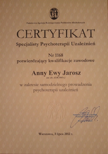 Jestem certyfikowaną terapeutką leczenia uzależnień i współuzależnienia w trakcie szkolenia z psychoterapii ogólnej w ramach Szkoły Psychoterapii INTRA. Certyfikat specjalistki psychoterapii uzależnień i współuzależnienia nr 1168 (z nazwiskiem panieńskim Jarosz).