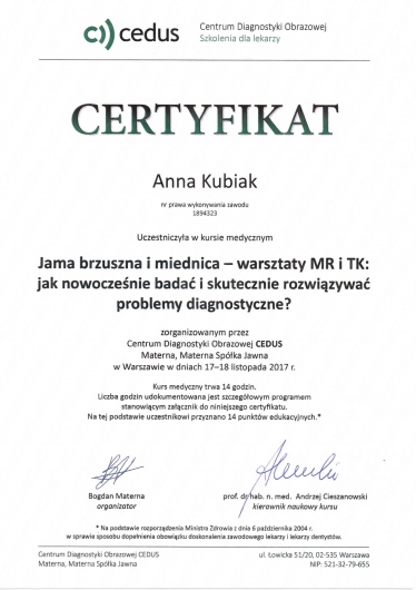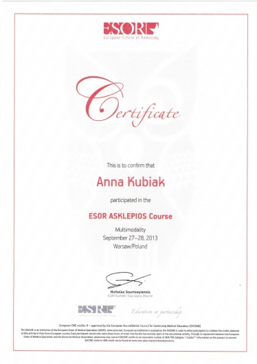 • Specjalizacja w Pomorskim Centrum Traumatologii szp. Wojewódzki Gdańsk (Egzamin specjalizacyjny – Radiologia i Diagnostyka Obrazowa – 20011r.)