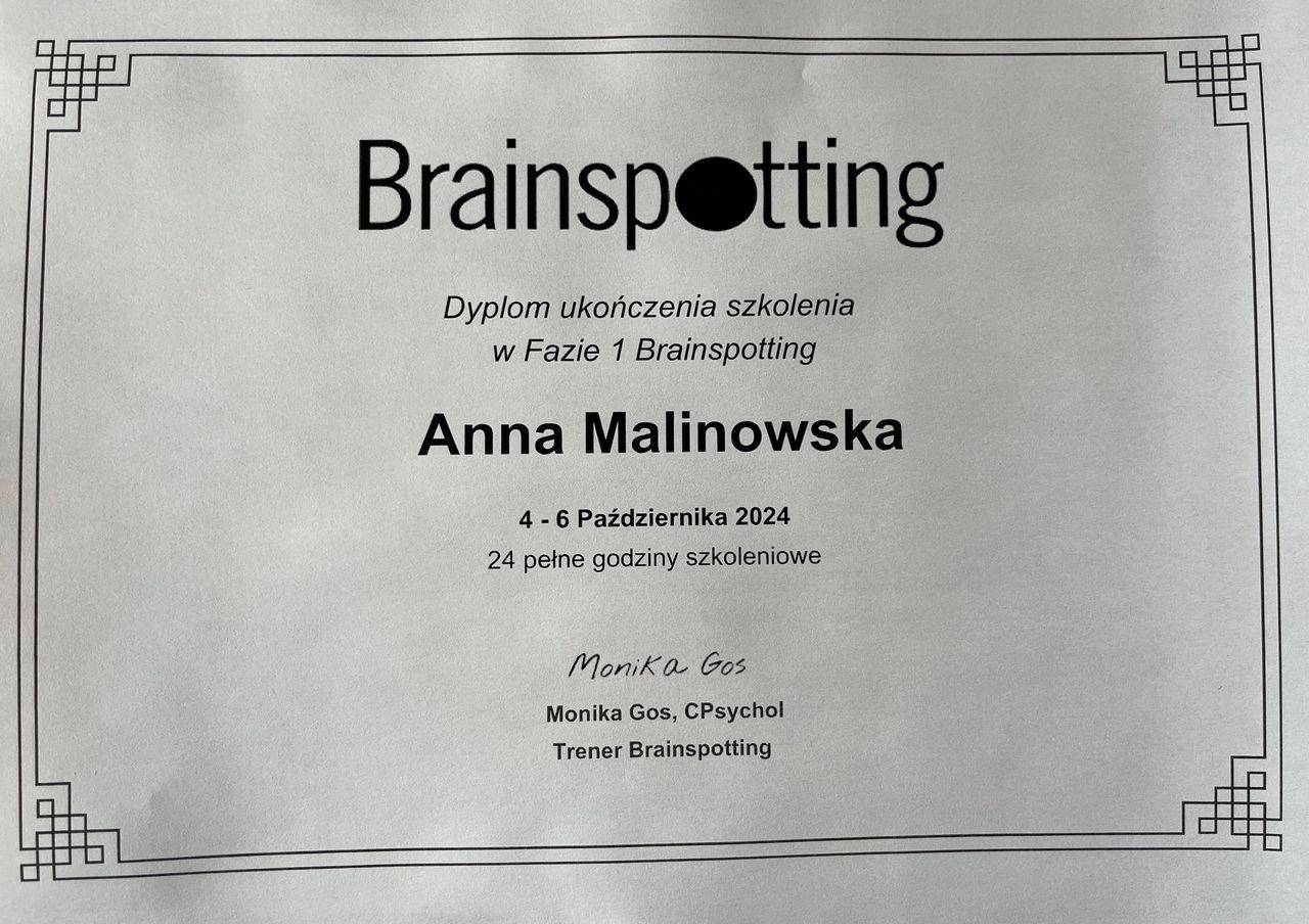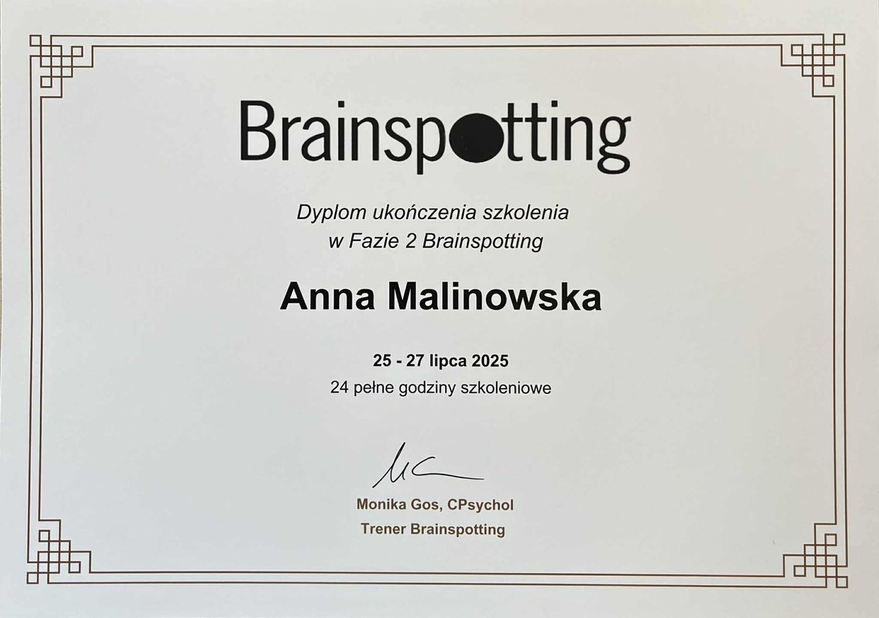 Wspieram również za pomocą metody Brainspotting (metody terapii neurodoświadczeniowej), która pozwala dotrzeć do głębokich źródeł trudnych emocji i wspomaga proces uzdrawiania. Tworzę bezpieczną przestrzeń do rozmowy i zmiany – w tempie, które jest dobre dla osoby potrzebującej wsparcia.