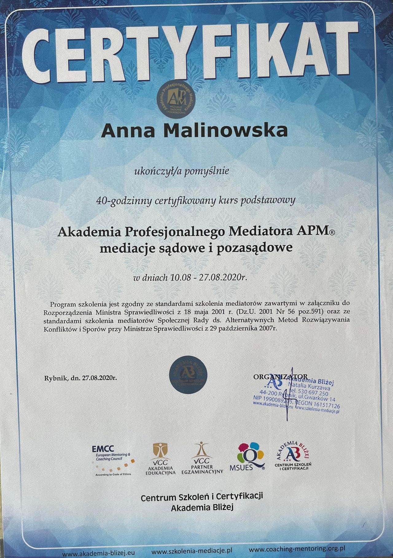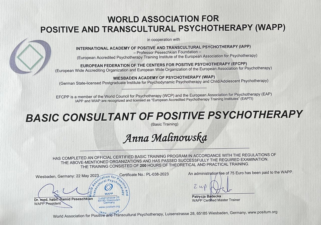 Jestem członkinią dwóch stowarzyszeń zawodowych: World Association for Positive and Transcultural Psychotherapy (WAPP) oraz Polskiego Towarzystwa Psychoterapii Stosowanej. Regularnie poddaję swoją pracę superwizji, dbając o jakość i etykę procesu terapeutycznego. Towarzyszę w zmianie z uważnością, szacunkiem i otwartością.