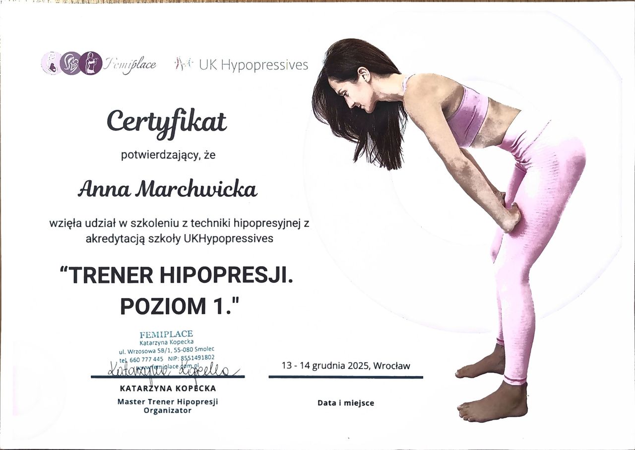 Trafiłam do Pani Ani w związku z przygotowaniem do operacji ginekologicznej. Dzięki jej profesjonalizmowi i indywidualnemu podejściu czułam się dobrze przygotowana do zabiegu, natomiast teraz pracujemy z blizną, a także wykonuję inne ćwiczenia, które pomagają wrócić do sprawności po operacji. Pani Ania ma ogromną wiedzę, a wizyty przebiegają w przyjaznej atmosferze. Z całego serca polecam terapię u Pani Ani.