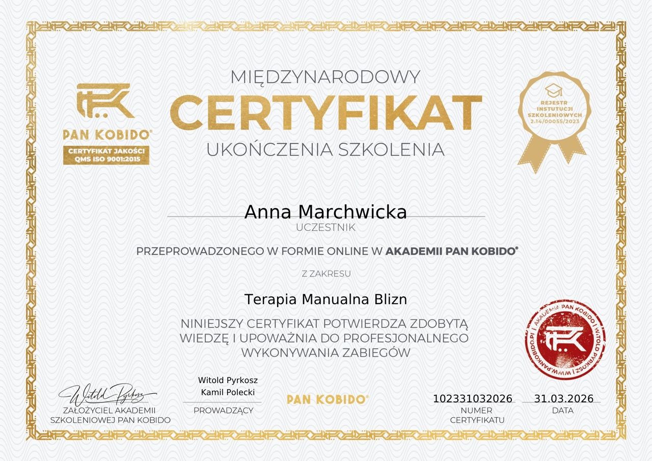 W 2015 roku ukończyłam Akademię Wychowania Fizycznego w Poznaniu na kierunku fizjoterapia. Od tego czasu nieustannie poszerzam swoją wiedzę i umiejętności, specjalizując się w fizjoterapii uroginekologicznej. Uczestniczyłam w licznych szkoleniach i kursach, aby zapewnić moim pacjentkom opiekę na najwyższym poziomie. Ukończyłam m.in.: - Masaż głęboki - PNF - warsztaty - MTG i wpływ na redukowanie bólów miesiączkowych, kinesiology taping w ciąży, masaż głęboki, przepona oddechowa - znaczenie i terapia - Aktywność fizyczna kobiet w ciąży i po porodzie - DRA rozejście kresy białej - Fizjoterapia w nietrzymaniu moczu i stolca oraz w obniżeniu narządów miednicy mniejszej - Trener Hipopresji Doskonale rozumiem potrzeby kobiet w tym wyjątkowym okresie ich życia. Z empatią i troską podchodzę do każdego problemu, dbając o komfort i bezpieczeństwo moich pacjentek. Zapraszam na konsultację, podczas której omówimy Twoje potrzeby i dobierzemy odpowiednią terapię.