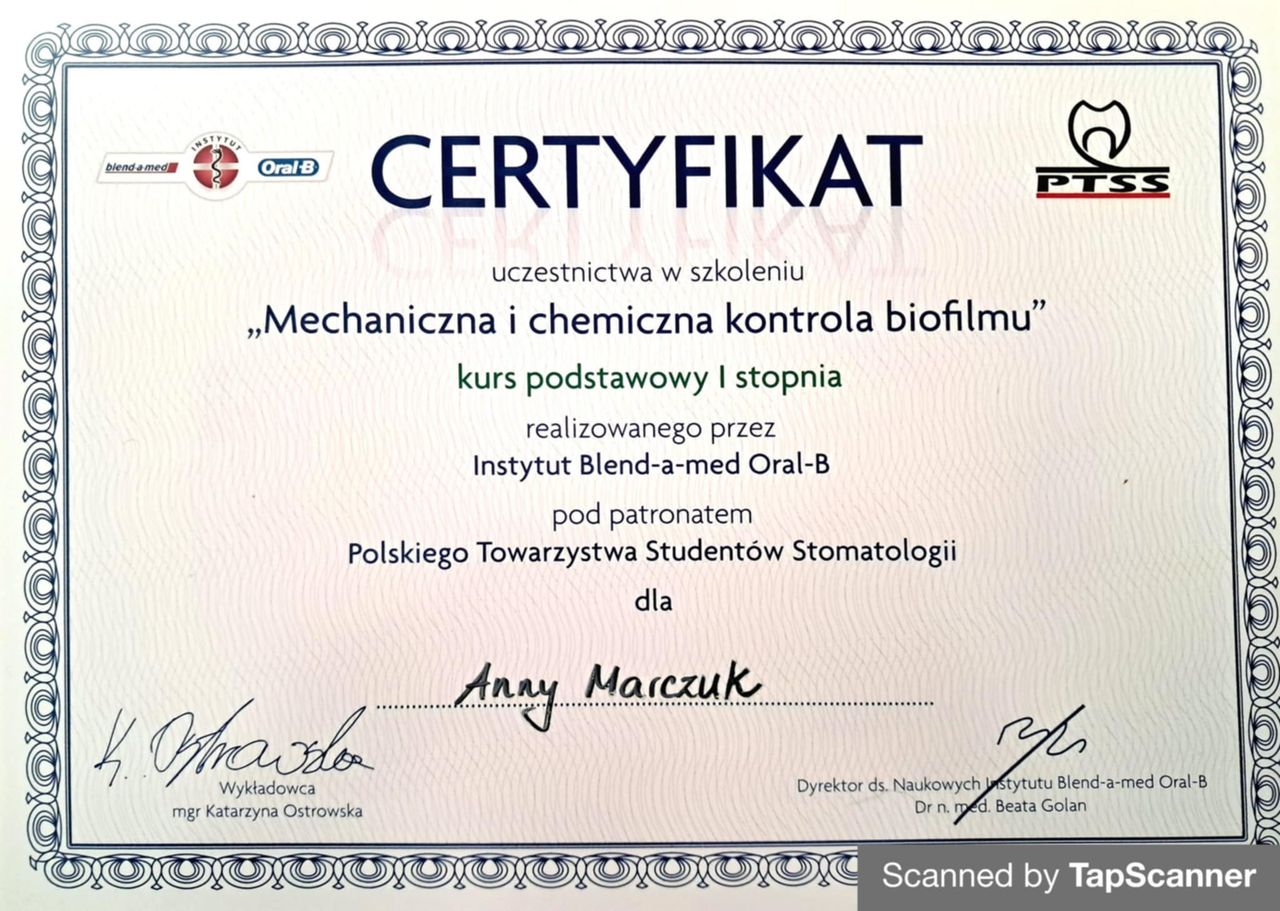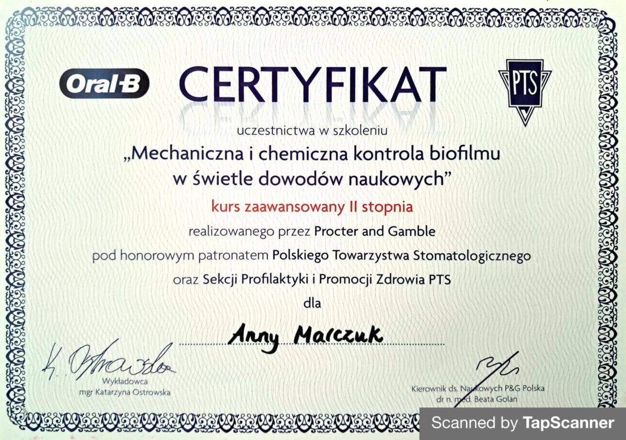 Jaki jest zakres porad oferowanych przez Anna Marczuk?Anna Marczuk to stomatolog. Na podstawie swojego doświadczenia i wykształcenia Anna Marczuk oferuje usługi takie jak: Konsultacja stomatologiczna, badania stomatologiczne, fluoryzacja zębów, leczenie próchnicy, piaskowanie, profilaktyka próchnicy, stomatologia estetyczna, Stomatologia zachowawcza, usuwanie kamienia nazębnego, wypełnienie kompozytowe.