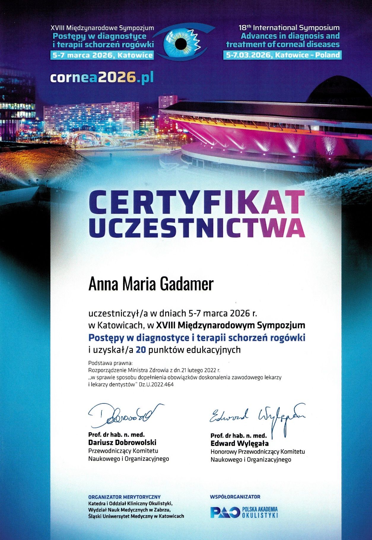 Należę do Polskiego Towarzystwa Okulistycznego. Regularnie biorę udział w konferencjach naukowych i kursach doskonalących, poszerzając wiedzę zgodnie z aktualnymi standardami oraz najnowszymi wytycznymi medycznymi.
