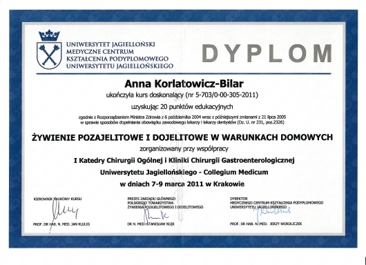 W 2011 roku ukończyła szkolenie Żywienie Pozajelitowe i Dojelitowe w warunkach domowych, zorganizowane przez Polskie Towarzystwo Żywienia Pozajelitowego i Dojelitowego.