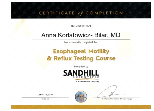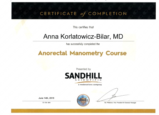 Umiejętności w zakresie gastroenterologii w latach 2011-2013 zdobywała w Klinice Gastroenterologii, Hepatologii, Zaburzeń Odżywiania i Pediatrii Centrum Zdrowia Dziecka w Warszawie. Posiada specjalizację z gastroenterologii, a także dyplom umiejętności wykonywania badań endoskopowych przewodu pokarmowego wydany przez Polskie Towarzystwo Gastroenterologii.