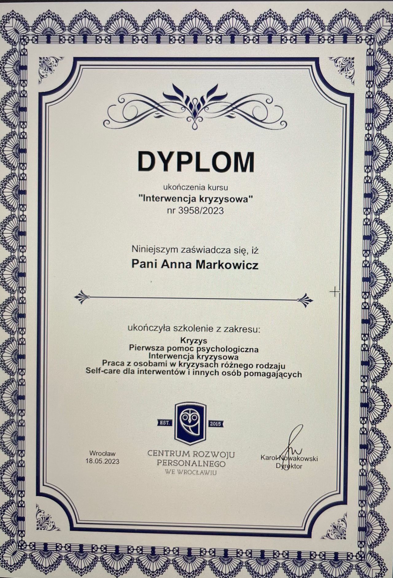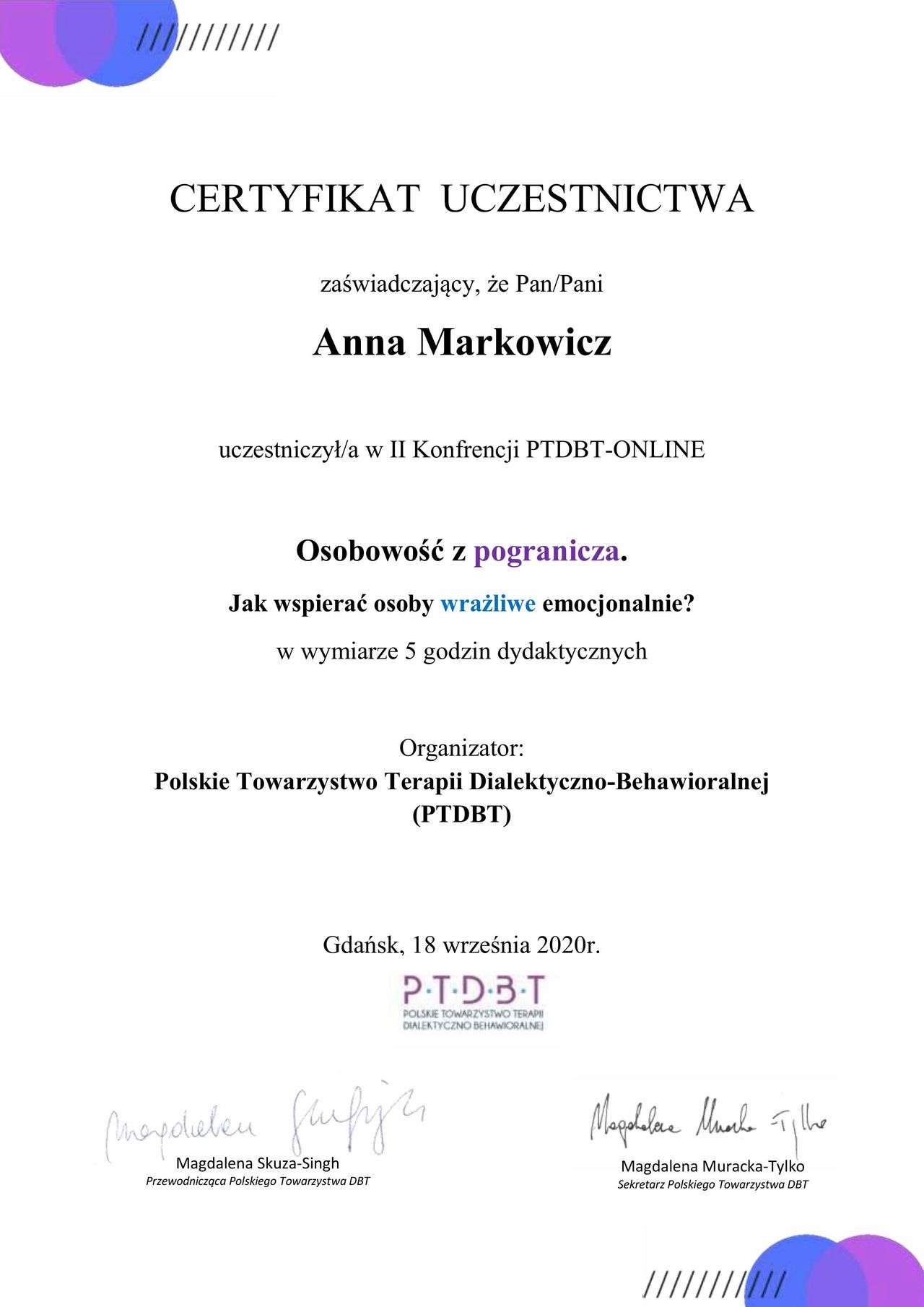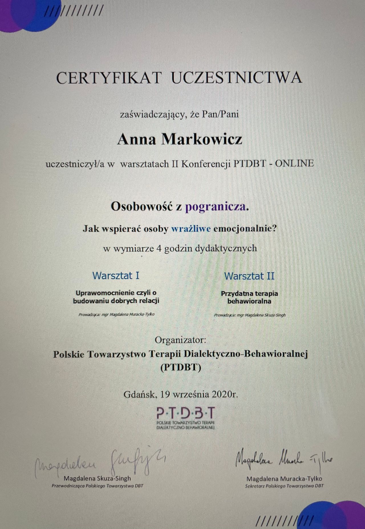 Nieustannie poszerzam swoje kompetencje uczestnicząc w szkoleniach i konferencjach psychologicznych. Pracuję zgodnie z Kodeksem Etycznym Psychologa, a swoją pracę poddaję regularnej superwizji. Należę do Polskiego Towarzystwa Terapii Poznawczej i Behawioralnej.