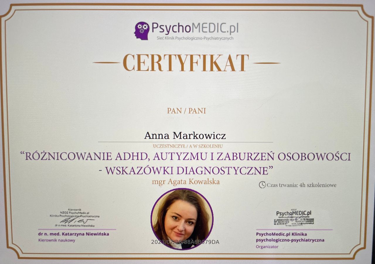 Jestem absolwentką studiów psychologicznych na Uniwersytecie Jagiellońskim w Krakowie oraz psychoterapeutką w trakcie szkolenia. Swoją drogę zawodową rozpoczęłam w Instytucie Poznawczym w Krakowie, gdzie rozwijałam umiejętności w zakresie diagnozy i pracy terapeutycznej w nurcie poznawczo-behawioralnym. Aktualnie jestem w trakcie całościowego szkolenia w Krakowskim Centrum Psychodynamicznym w nurcie psychodynamicznym, w ośrodku rekomendowanym przez Polskie Towarzystwo Psychologiczne.
