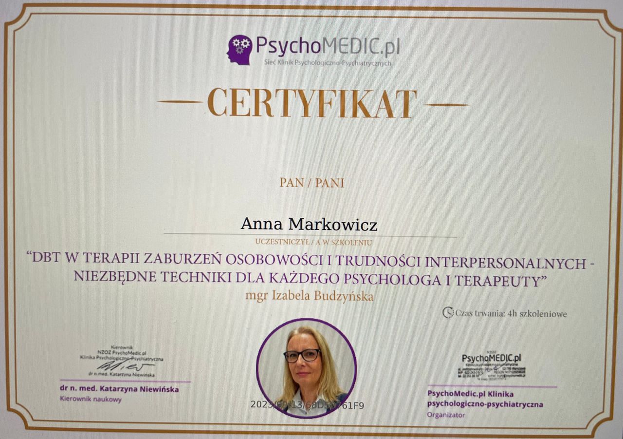 Pani Ania to osoba, która łączy empatię, profesjonalizm i głęboką wiedzę psychologiczną. Dzięki jej podejściu czułem się zrozumiany i wspierany na każdym etapie terapii. Z pełnym przekonaniem mogę polecić Panią Anię każdemu, kto szuka wsparcia psychologicznego i chce pracować nad sobą w bezpiecznej i przyjaznej atmosferze.