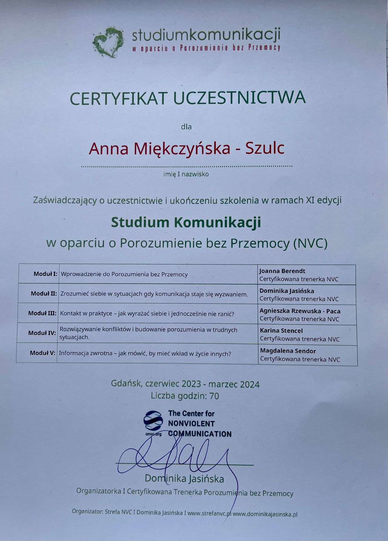Chcąc jak najlepiej wspierać moich Klientów, cały czas kształcę się na kursach, szkoleniach i konferencjach. Głównie w nurcie TSR i NVC.