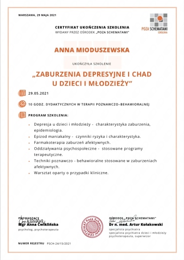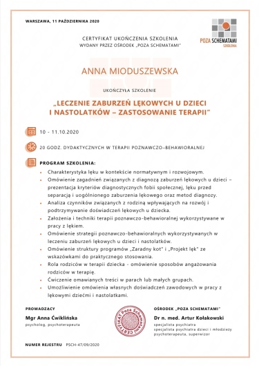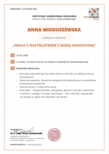 Jestem psychologiem, Certyfikowanym Psychoterapeutą Poznawczo-Behawioralnym PTTPB nr 1857. Ukończyłam 4-letnie studia podyplomowe w Warszawskiej Szkole Psychoterapii Poznawczo-Behawioralnej Uniwersytetu SWPS, rekomendowanej przez PTTPB oraz EABCT, a także studia podyplomowe na kierunku psychosomatyka i somatopsychologia na Uniwersytecie SWPS.