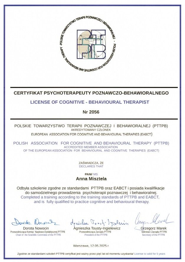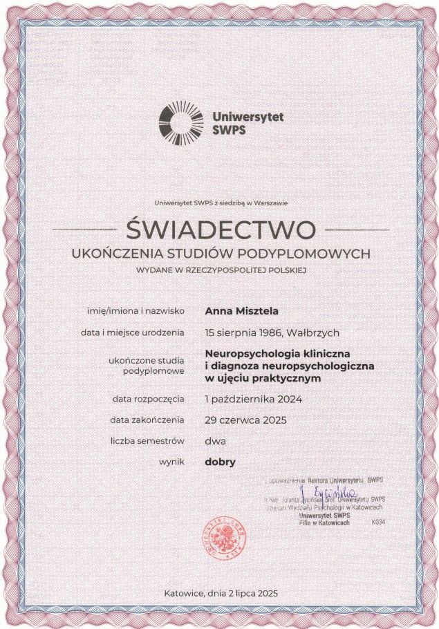 Jestem doktorką psychologii, wykładowczynią Uniwersytetu Wrocławskiego, psychoterapeutką poznawczo-behawioralna (cert. nr 2056), diagnostką neuropsychologii klinicznej.