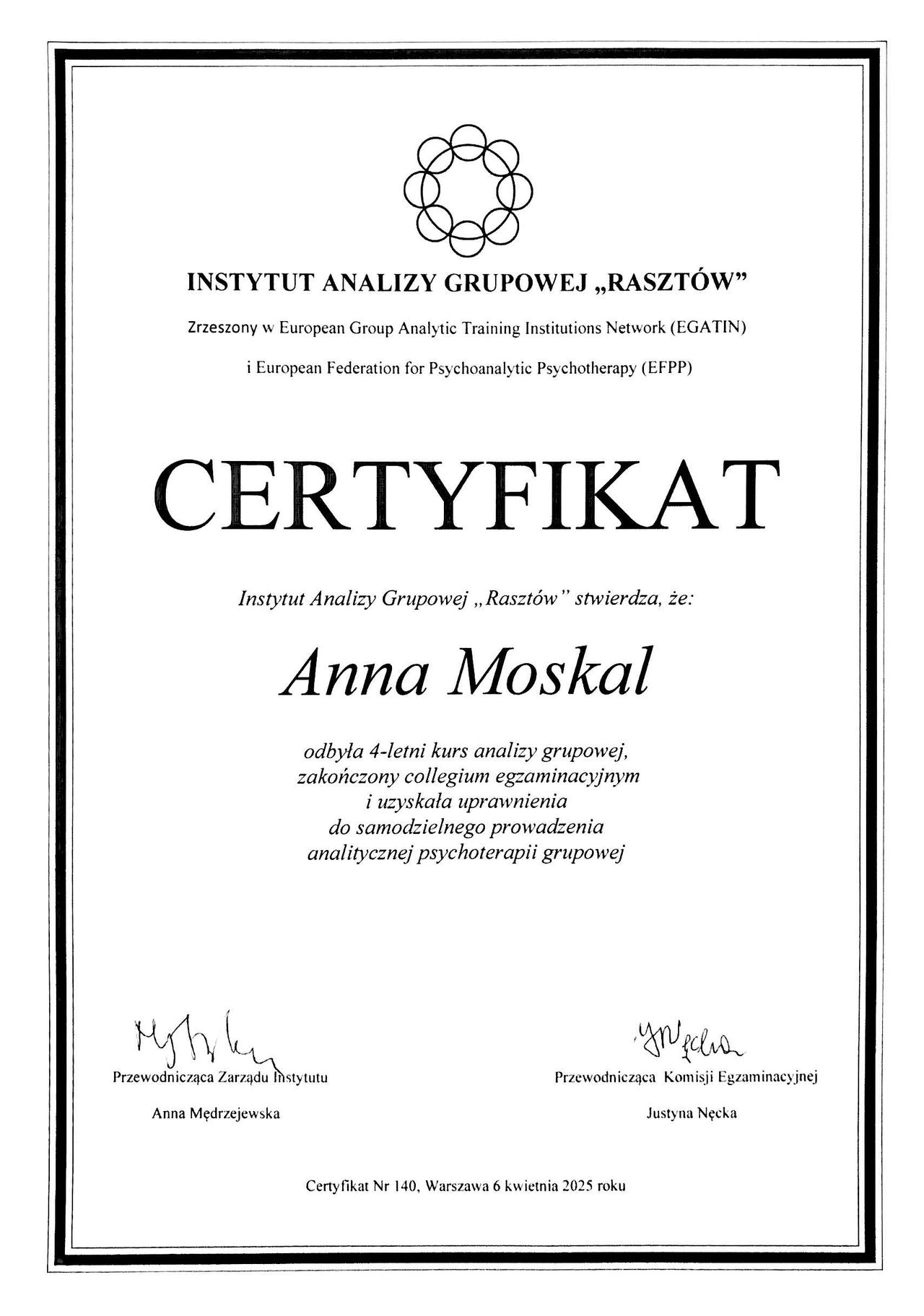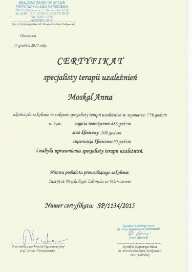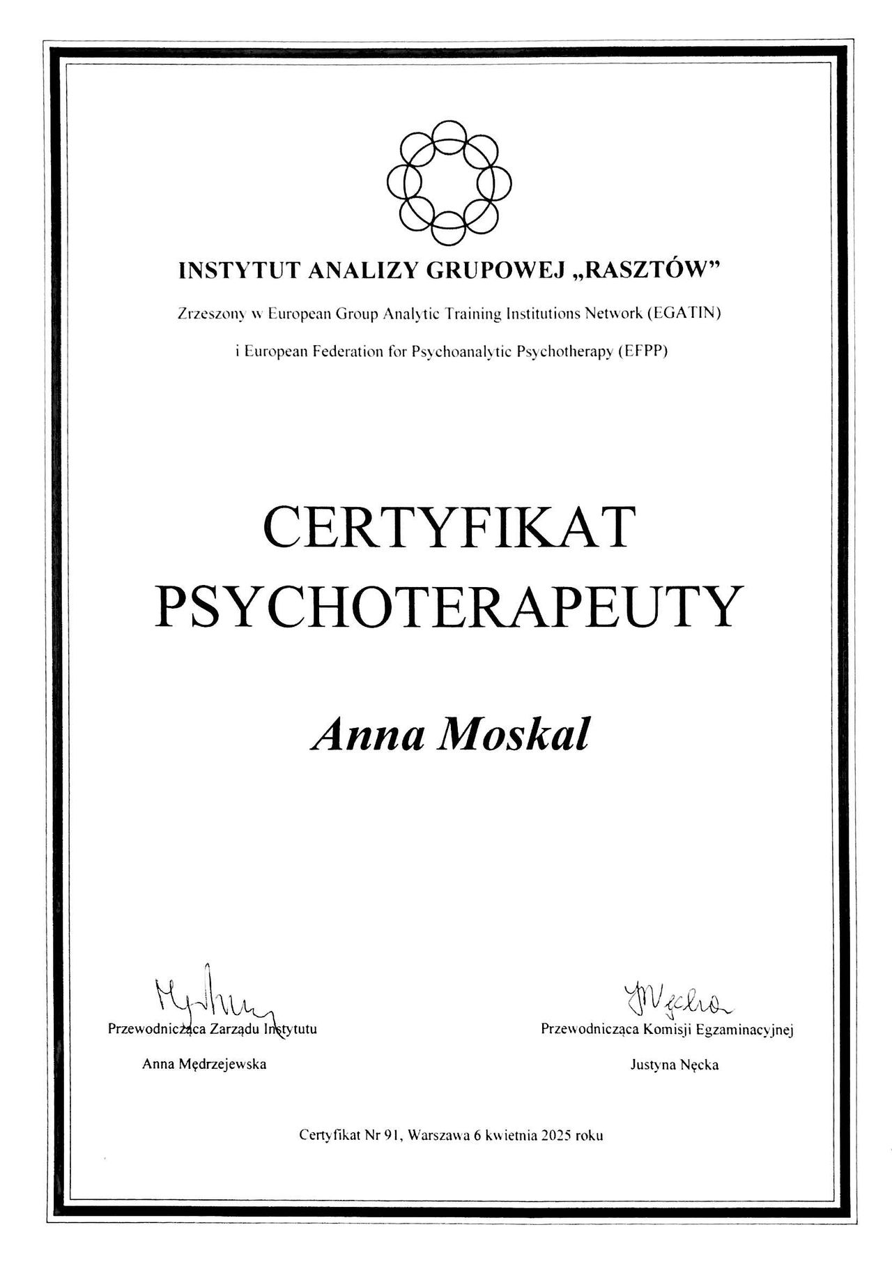 Jestem psycholożką, certyfikowaną psychoterapeutką, analityczką grupową, terapeutką uzależnień, wykładowczynią akademicką. Prowadzę terapię indywidualną i grupową oraz różnego rodzaju szkolenia, zajęcia i warsztaty. Ukończyłam całościowe szkolenie teoretyczne w zakresie analitycznie zorientowanej psychoterapii, indywidualnej i grupowej w Instytucie Analizy Grupowej „Rasztów”, zakończone uzyskaniem certyfikatu psychoterapeutki (Numer Certyfikatu: 91) i analityczki grupowej (Numer Certyfikatu: 140). Szkolenie to jest akredytowane przez Polskie Towarzystwo Psychologiczne i Polskie Towarzystwo Psychiatryczne. Jestem członkinią, kandydatką Instytutu Analizy Grupowej„Rasztów”. Jestem absolwentką Uniwersytetu Marii Curie- Skłodowskiej w Lublinie (UMCS), gdzie otrzymałem stopień magistra psychologii w specjalności psychologia kliniczna. Zdobyłam uprawnienia pedagogiczne w drodze studiów podyplomowych w Wyższej Szkole Przedsiębiorczości i Administracji w Lublinie. Ponadto jestem absolwentką szkolenia terapeutycznego w zakresie terapii uzależnień w Instytucie Psychologii Zdrowia Polskiego Towarzystwa Psychologicznego w Warszawie. Posiadam certyfikat specjalistki terapii uzależnień (Numer Certyfikatu: SP/1134/2015) Uczestniczyłam także w kursie pomocy dzieciom z rodzin z problemem alkoholowym, organizowanym przez Fundację ETOH. W obszarze moich zainteresowań zawodowych pozostaje praca z osobami dorosłymi, które na co dzień przeżywają różne trudności emocjonalne, znajdują się w kryzysie, zmagają się z przewlekłymi chorobami somatycznymi oraz psychicznymi, doświadczają objawów depresyjnych oraz lękowych, zaburzeń osobowości czy łaknienia. Pomagam również osobom uzależnionym (behawioralne od czynności oraz od substancji psychoaktywnych), klientom z rodzin obciążonych uzależnieniem, osobom współuzależnionym oraz klientom z syndromem DDA. Ponadto pracuję z nastolatkami, które zmagają się z różnorodnymi trudnościami okresu dorastania: niską samooceną, trudnościami w relacjach z rówieśnikami czy też dorosłymi, wyrażaniem własnych potrzeb i emocji, wybuchami złości, autoagresją czy też nadużywają multimediów. Pracuję również z osobami LGBTQiA. Sesje prowadzę stacjonarnie w gabinecie na warszawskiej Woli lub w formie połączenia online.Pracuję z osobami z Polski i z tymi mieszkającymi za granicą.Pracę terapeutyczną poddaję stałej superwizji.