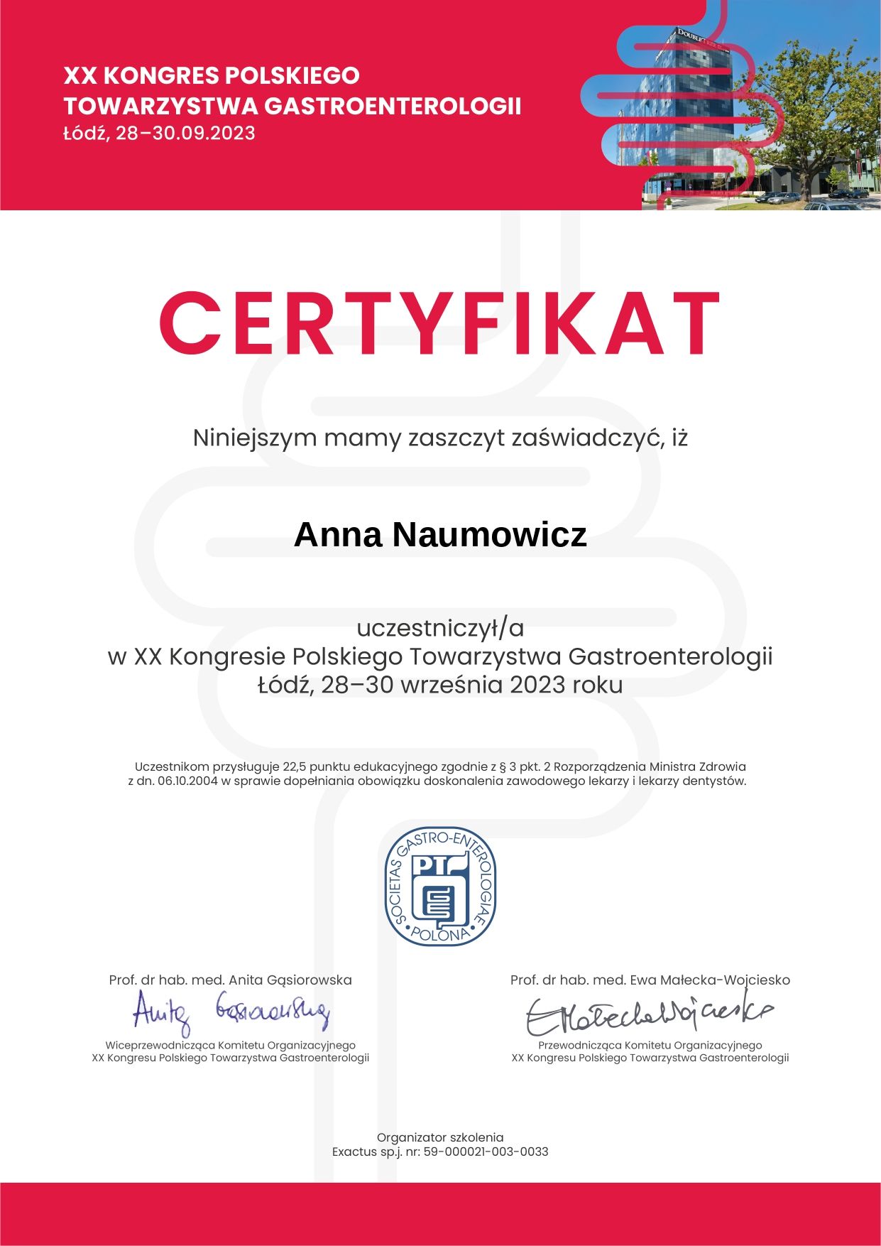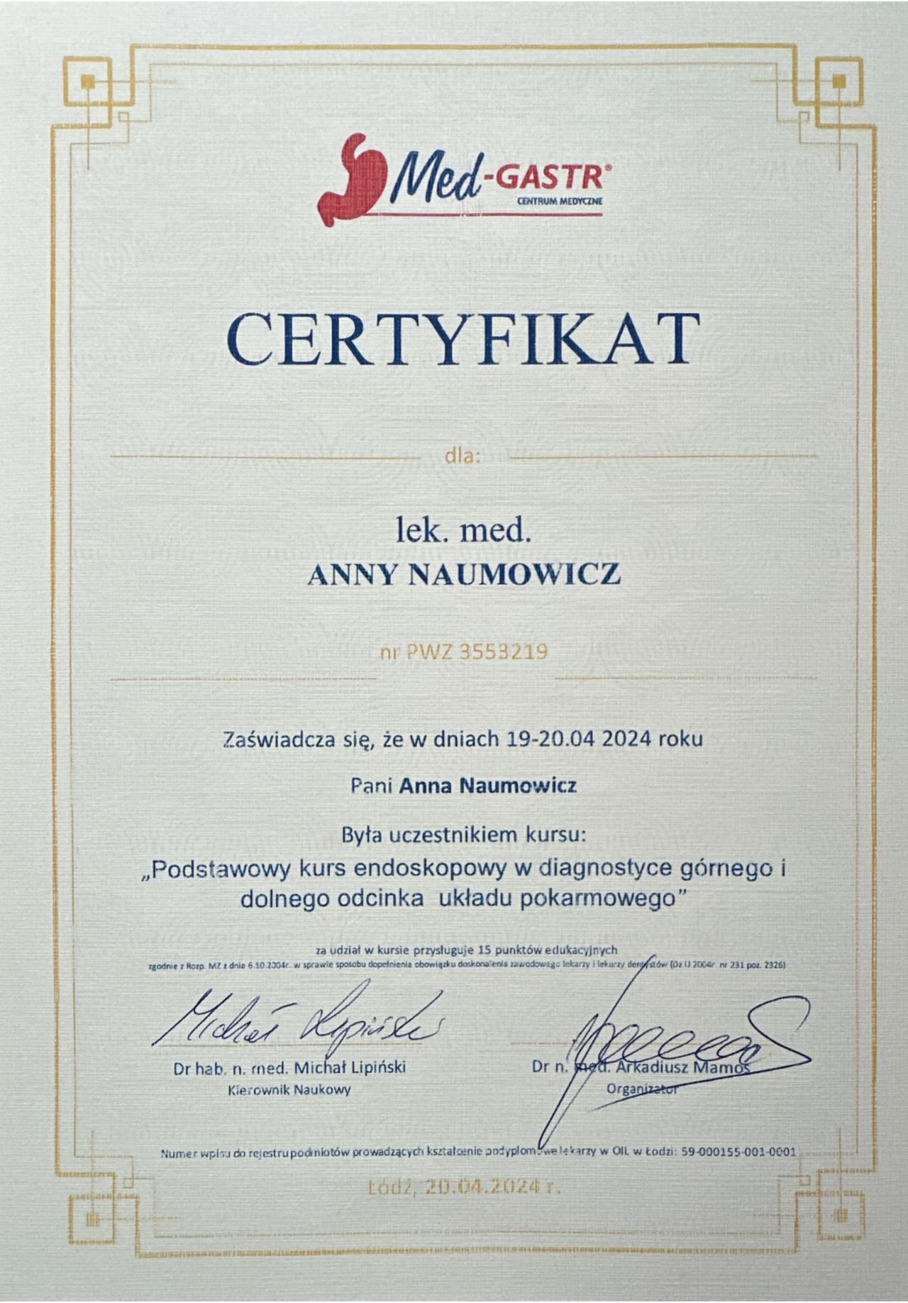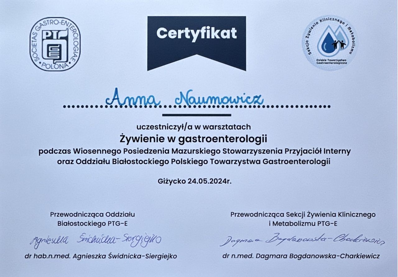 Ukończyłam kierunek lekarski na Uniwersytecie Medycznym w Białymstoku. Na co dzień pracuję w Klinice Gastroenterologii i Chorób Wewnętrznych Uniwersyteckiego Szpitala Klinicznego, gdzie odbywam szkolenie specjalizacyjne. W swojej pracy zajmuję się diagnostyką i leczeniem schorzeń układu pokarmowego, a w szczególności prowadzę terapię pacjentów z nieswoistymi chorobami zapalnymi jelit oraz wykonuję badania endoskopowe. Jestem członkiem Polskiego Towarzystwa Gastroenterologii, a regularny udział w szkoleniach i konferencjach daje mi możliwość zapewnienia moim pacjentom postępowania zgodnie z najnowszą wiedzą medyczną i standardami leczenia. W pracy z pacjentem - poza zapewnieniem zaplecza merytorycznego z mojej strony - cenię sobie zaufanie ze strony chorego. Dlatego przykładam dużą wagę do wyjaśnienia istoty problemu zdrowotnego, tak aby pacjent mógł świadomie współuczestniczyć w procesie leczenia.