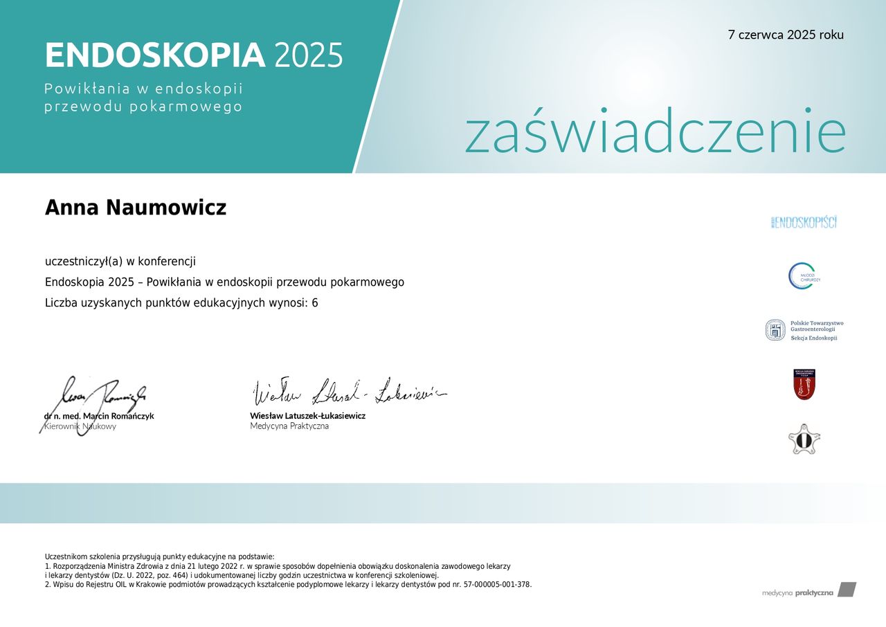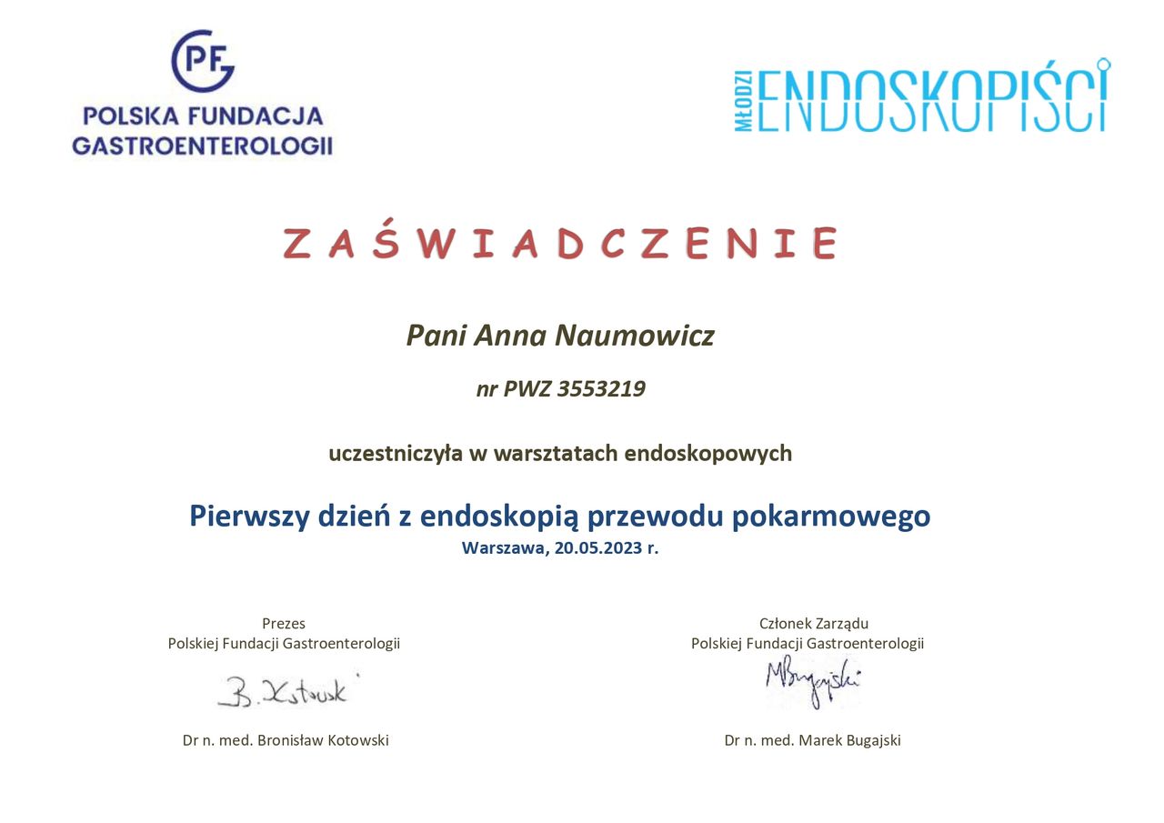 Jaki jest zakres porad oferowanych przez Anna Naumowicz?Anna Naumowicz to w trakcie specjalizacji (gastrolog). Na podstawie swojego doświadczenia i wykształcenia Anna Naumowicz oferuje usługi takie jak: konsultacja gastrologiczna.