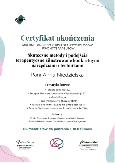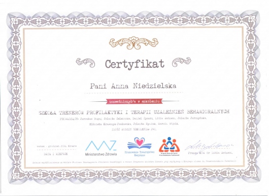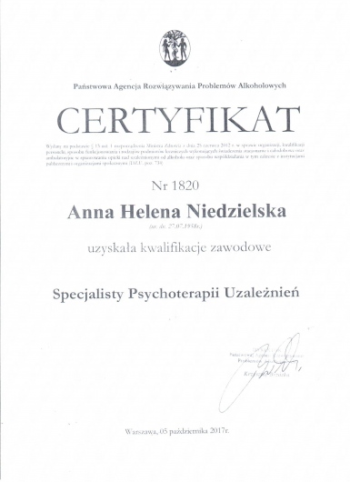 Pani Anna to przede wszystkim prawdziwa profesjonalistka a także osoba odbarzona darem bardzo uważnego słuchania, empatią i dużym poczuciem humoru i wszystko to sprawia, że terapia przebiega w atmosferze zachęcającej do otwierania się i stawiania czoła temu, co nas boli. Najważniejsze jest jednak to, że terapia jest skuteczna i pozwala zacząć nowe życie