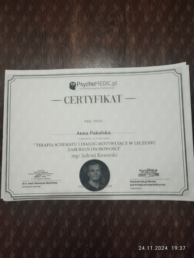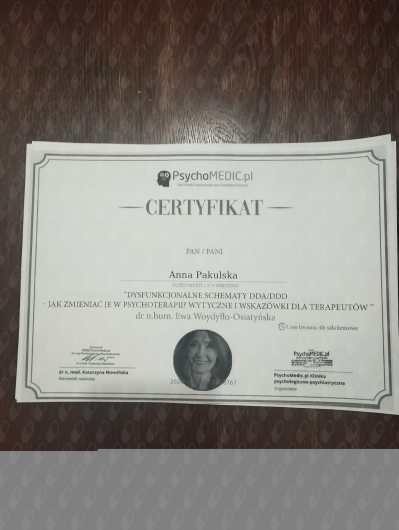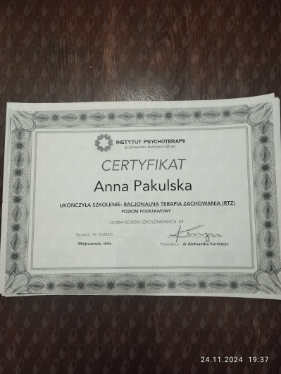 Aktualnie uczę się w Szkole Terapii Poznawczo-Behawioralnej CBT-EDU w Warszawie (całościowe szkolenie z psychoterapii poznawczo-behawioralnej rekomendowane przez Polskie Towarzystwo Terapii Poznawczej i Behawioralnej PTTPB i European Association for Behavioural and Cognitive Therapies EABCT).