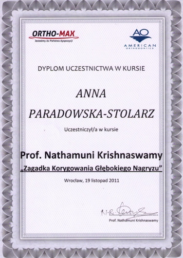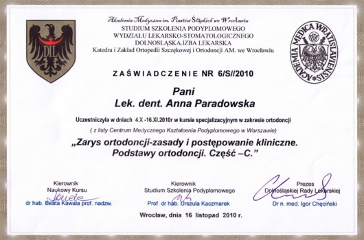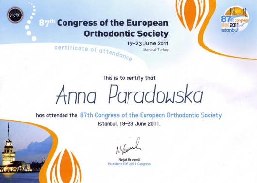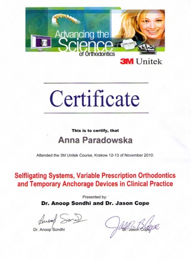 Uczestniczę w licznych szkoleniach ortodontycznych, uzyskałam również dyplom specjalisty w dziedzinie ortodoncji.