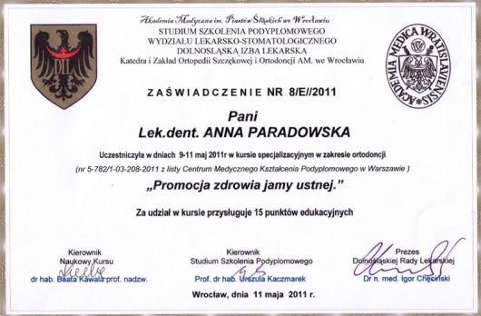 W czerwcu 2013 roku obroniłam pracę doktorską z dziedziny ortodoncji, zdając wszystkie egzaminy na oceny bardzo dobre. Ponadto posiadam tytuł specjalisty w dziedzinie ortodoncji - egzamin złożony przed ogólnopolską komisją.