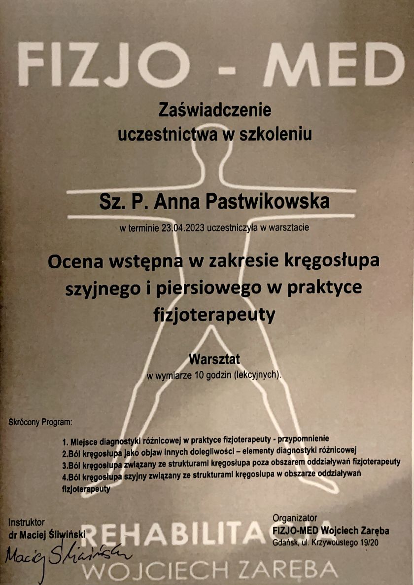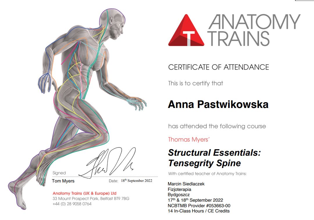 Uczę pacjentów, jak w bezpieczny sposób mogą sami stosować plastry do tapyingu. W pracy z pacjentem wykorzystuję techniki i metody m.in. z Anatomy Trains, Zoga Face czy MTG. Podczas terapii istotna jest dla mnie edukacja pacjenta oraz zapewnienie każdemu najwyższego komfortu.