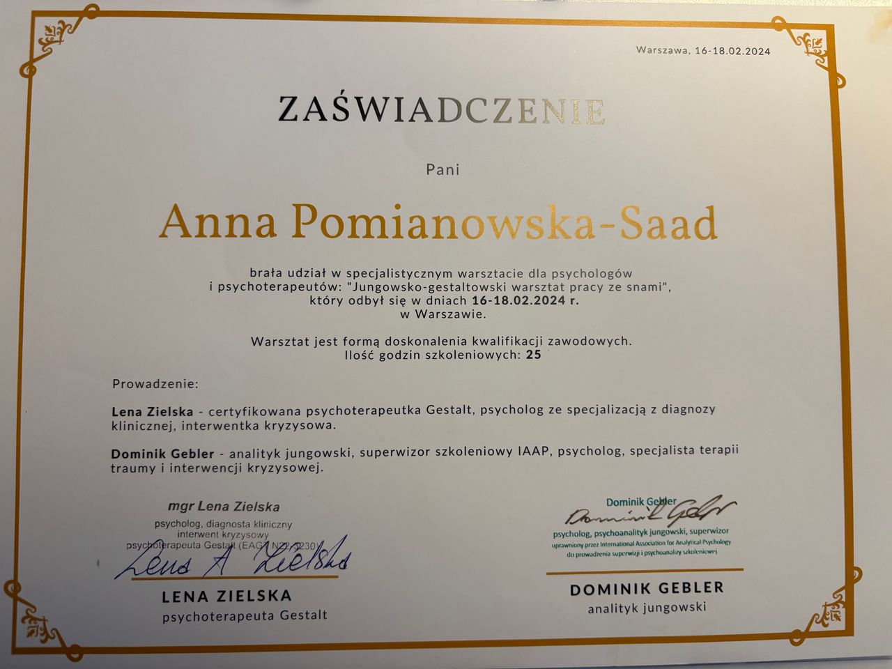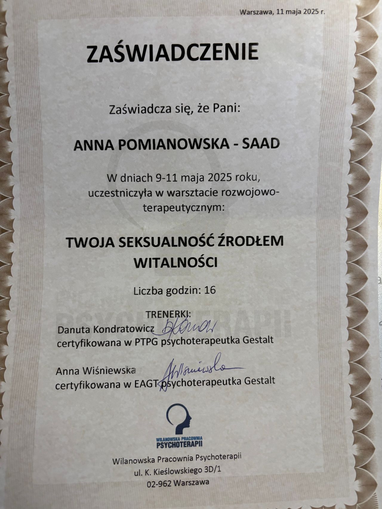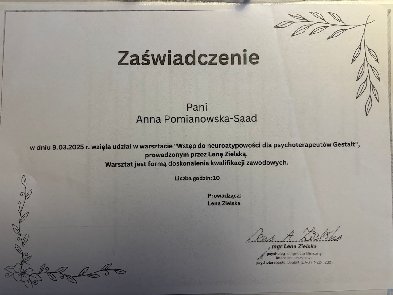 Stale staram się podnosić swoje umiejętności, uczestniczyłam m.in. w następujących szkoleniach: "Wstęp do neuroatypowości dla psychoterapeutów Gestalt", "Rozwijanie osobistych kompetencji psychoterapeuty", "Jungowsko-gestaltowski warsztat pracy ze snem", "Trauma i jej leczenie z perspektywy psychoterapii Gestalt", "Ataki paniki w psychoterapii Gestalt".